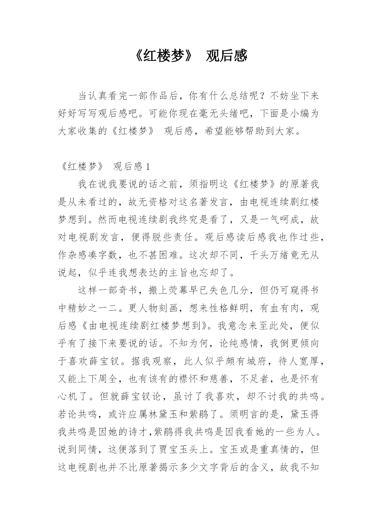 《红楼梦》观后感当认真看完一部作品后,你有什么总结呢?不妨坐下来好好写写观后感吧。可能你现在毫无头绪吧,下面是小编为大家收集的《红楼梦》观后感,希望能够帮助到大家。《红楼梦》观后感1我在说我要说的话之前,须指明这《红楼梦》的原著我是从未看过的,故无资格对这名著发言,由电视连续剧红楼梦想到。然而电视连续剧我终究是看了,又是一气呵成,故对电视剧发言,便得脱些责任。观后感读后感我也作过些,作杂感凑字数,也不甚困难。这次却不同,千头万绪竟无从说起,似乎连我想表达的主旨也忘却了。这样一部奇书,搬上荧幕早已失色几分,