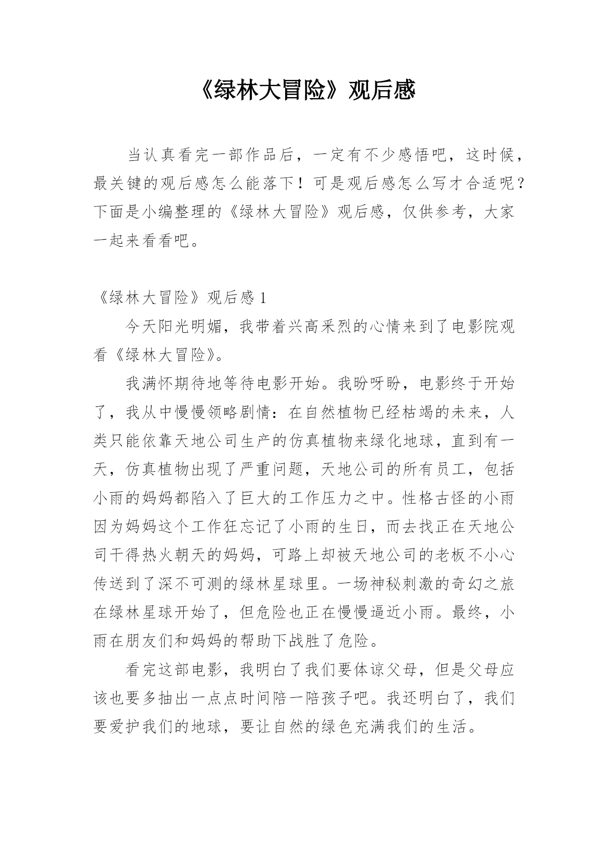 《绿林大冒险》观后感当认真看完一部作品后,一定有不少感悟吧,这时候,最关键的观后感怎么能落下!可是观后感怎么写才合适呢?下面是小编整理的《绿林大冒险》观后感,仅供参考,大家一起来看看吧。《绿林大冒险》观后感1今天阳光明媚,我带着兴高釆烈的心情来到了电影院观看《绿林大冒险》。我满怀期待地等待电影开始。我昐呀盼,电影终于开始了,我从中慢慢领略剧情:在自然植物已经枯竭的未来,人类只能依靠天地公司生产的仿真植物来绿化地球,直到有一天,仿真植物出现了严重问题,天地公司的所有员工,包括小雨的妈妈都陷入了巨大的工作压力