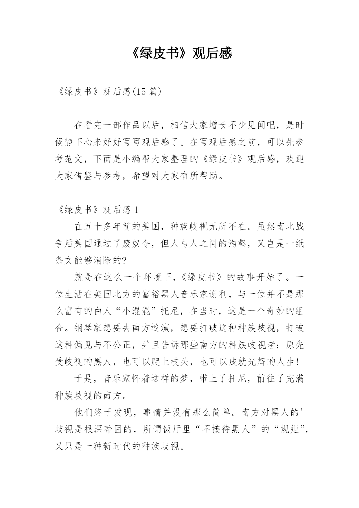 《绿皮书》观后感《绿皮书》观后感(15篇)在看完一部作品以后,相信大家增长不少见闻吧,是时候静下心来好好写写观后感了。在写观后感之前,可以先参考范文,下面是小编帮大家整理的《绿皮书》观后感,欢迎大家借鉴与参考,希望对大家有所帮助。《绿皮书》观后感1在五十多年前的美国,种族歧视无所不在。虽然南北战争后美国通过了废奴令,但人与人之间的沟壑,又岂是一纸条文能够消除的?就是在这么一个环境下,《绿皮书》的故事开始了。一位生活在美国北方的富裕黑人音乐家谢利,与一位并不是那么富有的白人“小混混”托尼,在当时,这是一个奇