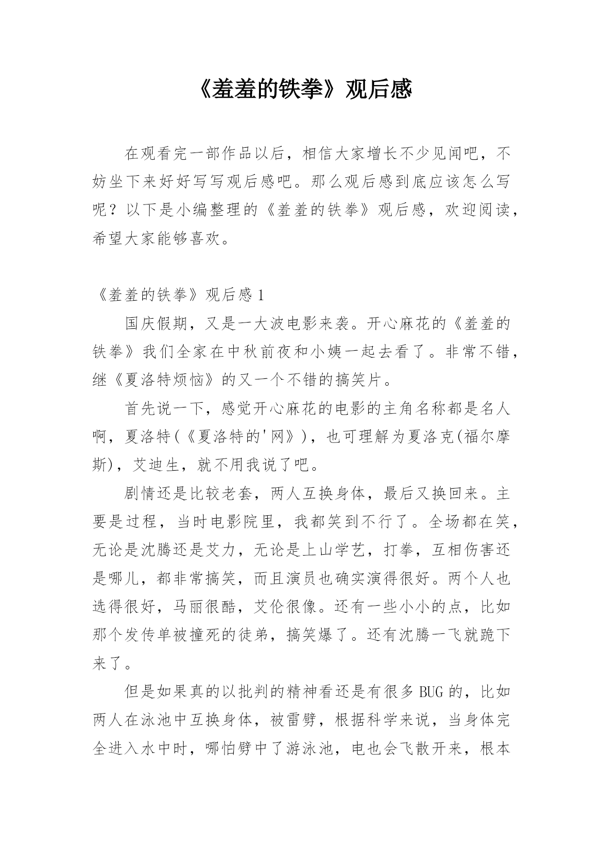 《羞羞的铁拳》观后感在观看完一部作品以后,相信大家增长不少见闻吧,不妨坐下来好好写写观后感吧。那么观后感到底应该怎么写呢?以下是小编整理的《羞羞的铁拳》观后感,欢迎阅读,希望大家能够喜欢。《羞羞的铁拳》观后感1国庆假期,又是一大波电影来袭。开心麻花的《羞羞的铁拳》我们全家在中秋前夜和小姨一起去看了。非常不错,继《夏洛特烦恼》的又一个不错的搞笑片。首先说一下,感觉开心麻花的电影的主角名称都是名人啊,夏洛特(《夏洛特的'网》),也可理解为夏洛克(福尔摩斯),艾迪生,就不用我说了吧。剧情还是比较老套,两人互换身