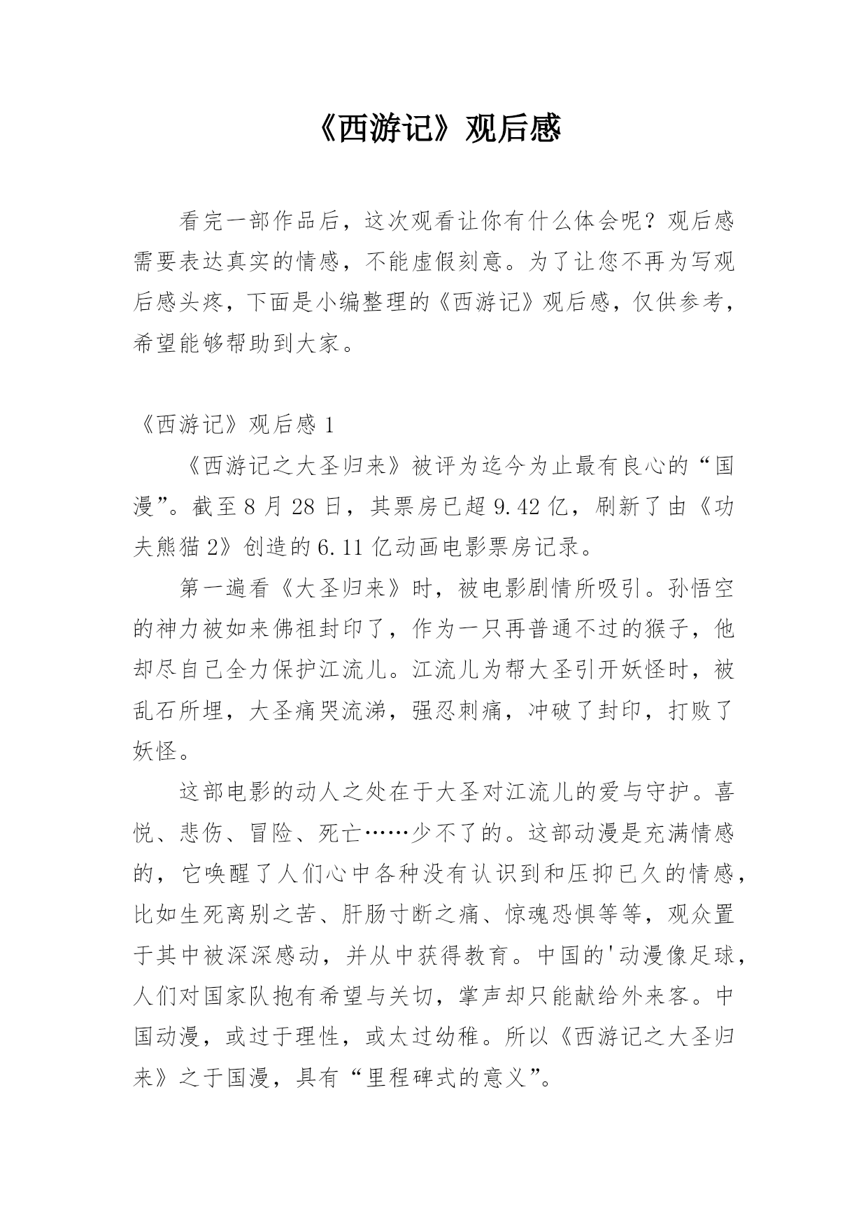 《西游记》观后感看完一部作品后,这次观看让你有什么体会呢?观后感需要表达真实的情感,不能虚假刻意。为了让您不再为写观后感头疼,下面是小编整理的《西游记》观后感,仅供参考,希望能够帮助到大家。《西游记》观后感1《西游记之大圣归来》被评为迄今为止最有良心的“国漫”。截至8月28日,其票房已超9.42亿,刷新了由《功夫熊猫2》创造的6.11亿动画电影票房记录。第一遍看《大圣归来》时,被电影剧情所吸引。孙悟空的神力被如来佛祖封印了,作为一只再普通不过的猴子,他却尽自己全力保护江流儿。江流儿为帮大圣引开妖怪时,被乱