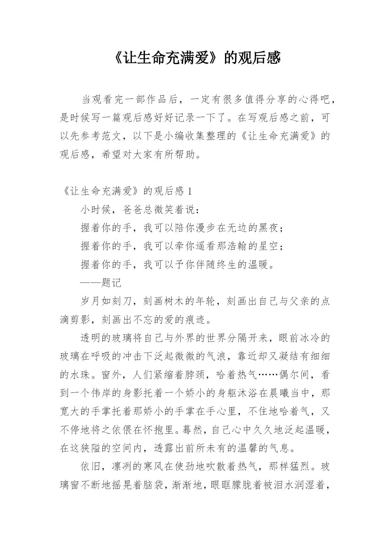 《让生命充满爱》的观后感当观看完一部作品后,一定有很多值得分享的心得吧,是时候写一篇观后感好好记录一下了。在写观后感之前,可以先参考范文,以下是小编收集整理的《让生命充满爱》的观后感,希望对大家有所帮助。《让生命充满爱》的观后感1小时候,爸爸总微笑着说:握着你的手,我可以陪你漫步在无边的黑夜;握着你的手,我可以牵你遥看那浩翰的星空;握着你的手,我可以予你伴随终生的温暖。——题记岁月如刻刀,刻画树木的年轮,刻画出自己与父亲的点滴剪影,刻画出不忘的爱的痕迹。透明的玻璃将自己与外界的世界分隔开来,眼前冰冷的玻璃