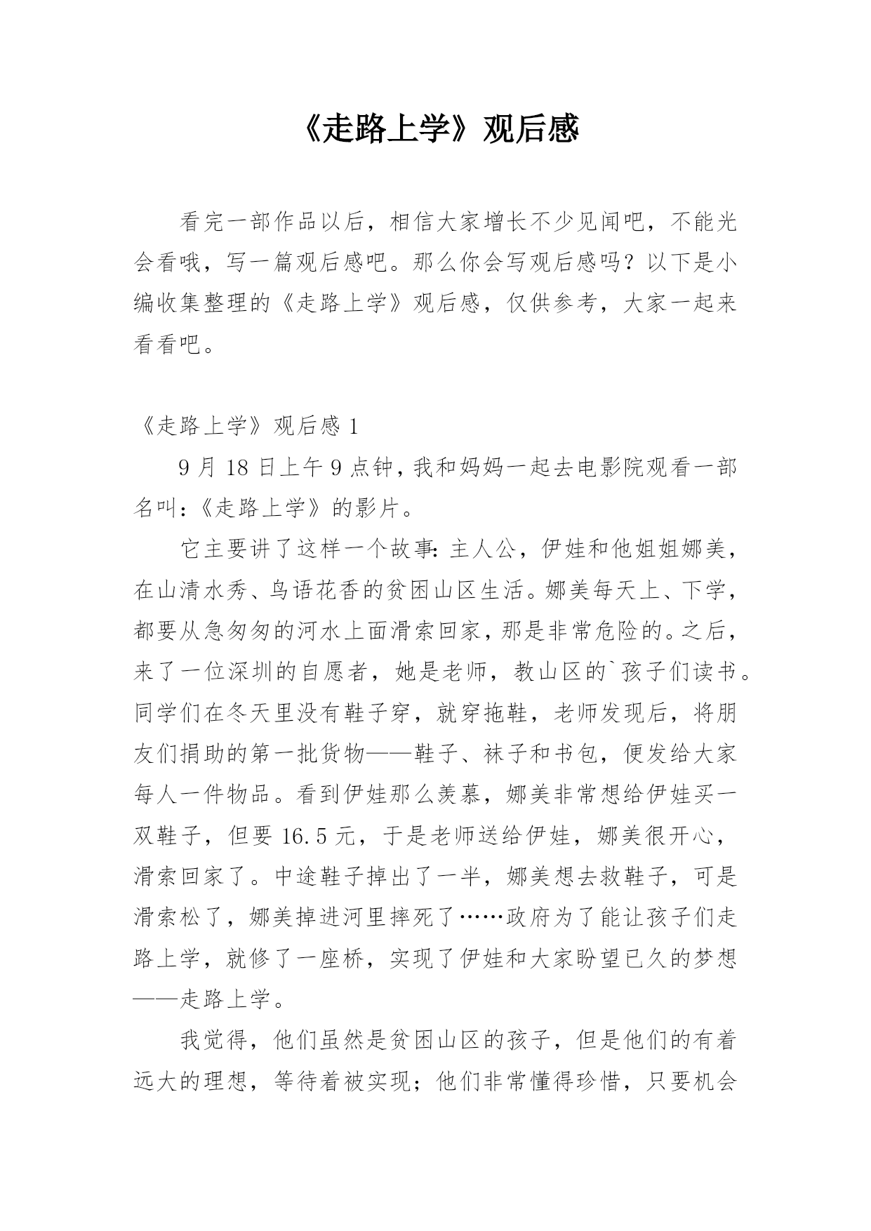 《走路上学》观后感看完一部作品以后,相信大家增长不少见闻吧,不能光会看哦,写一篇观后感吧。那么你会写观后感吗?以下是小编收集整理的《走路上学》观后感,仅供参考,大家一起来看看吧。《走路上学》观后感19月18日上午9点钟,我和妈妈一起去电影院观看一部名叫:《走路上学》的影片。它主要讲了这样一个故事:主人公,伊娃和他姐姐娜美,在山清水秀、鸟语花香的贫困山区生活。娜美每天上、下学,都要从急匆匆的河水上面滑索回家,那是非常危险的。之后,来了一位深圳的自愿者,她是老师,教山区的`孩子们读书。同学们在冬天里没有鞋子穿