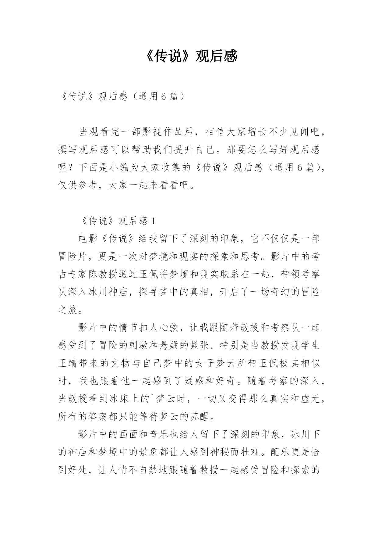 《传说》观后感《传说》观后感(通用6篇)当观看完一部影视作品后,相信大家增长不少见闻吧,撰写观后感可以帮助我们提升自己。那要怎么写好观后感呢?下面是小编为大家收集的《传说》观后感(通用6篇),仅供参考,大家一起来看看吧。《传说》观后感1电影《传说》给我留下了深刻的印象,它不仅仅是一部冒险片,更是一次对梦境和现实的探索和思考。影片中的考古专家陈教授通过玉佩将梦境和现实联系在一起,带领考察队深入冰川神庙,探寻梦中的真相,开启了一场奇幻的冒险之旅。影片中的情节扣人心弦,让我跟随着教授和考察队一起感受到了冒险的刺