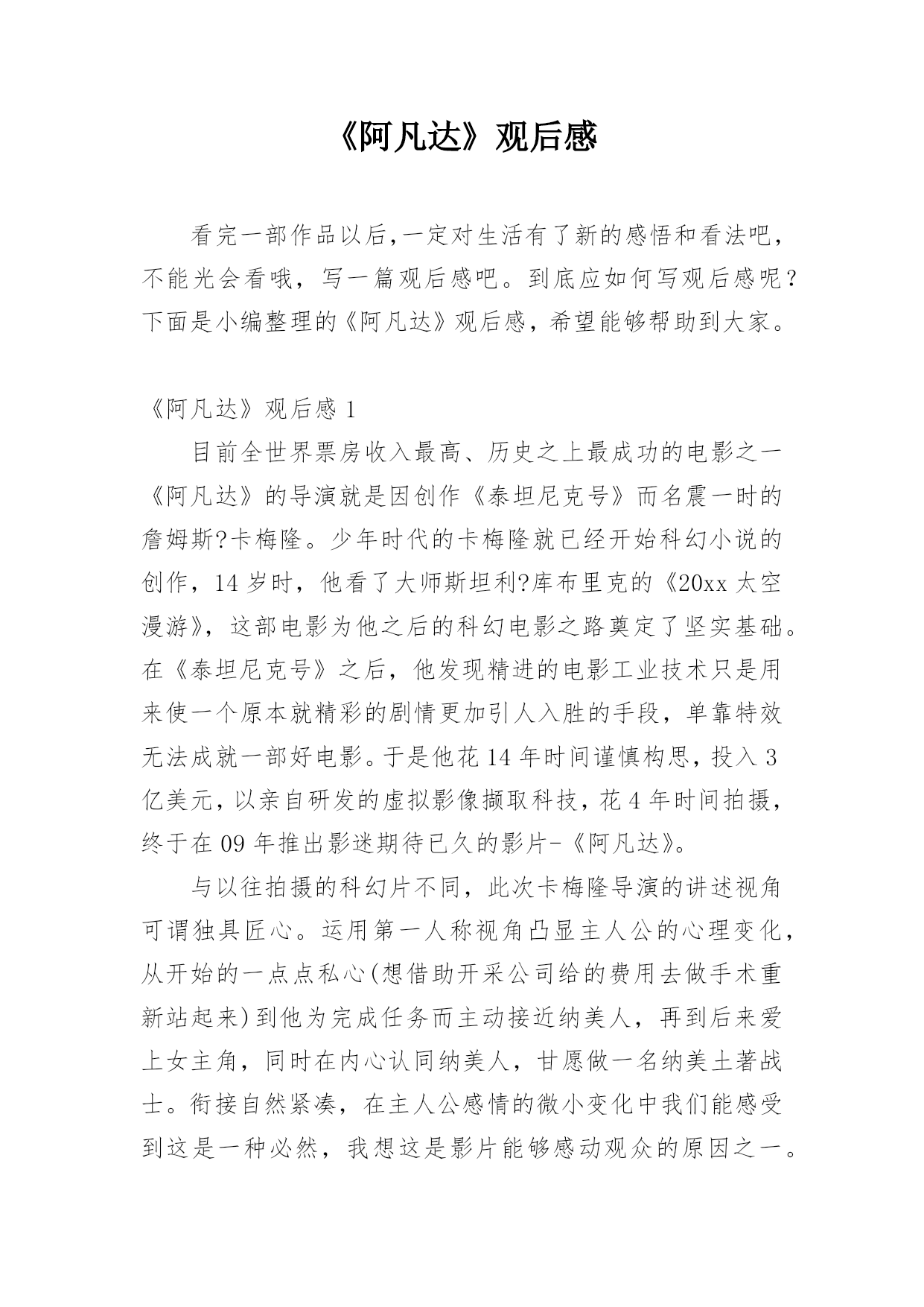《阿凡达》观后感看完一部作品以后,一定对生活有了新的感悟和看法吧,不能光会看哦,写一篇观后感吧。到底应如何写观后感呢?下面是小编整理的《阿凡达》观后感,希望能够帮助到大家。《阿凡达》观后感1目前全世界票房收入最高、历史之上最成功的电影之一《阿凡达》的导演就是因创作《泰坦尼克号》而名震一时的詹姆斯?卡梅隆。少年时代的卡梅隆就已经开始科幻小说的创作,14岁时,他看了大师斯坦利?库布里克的《20xx太空漫游》,这部电影为他之后的科幻电影之路奠定了坚实基础。在《泰坦尼克号》之后,他发现精进的电影工业技术只是用来使
