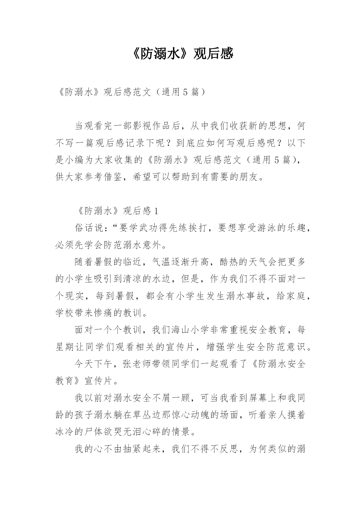 《防溺水》观后感《防溺水》观后感范文(通用5篇)当观看完一部影视作品后,从中我们收获新的思想,何不写一篇观后感记录下呢?到底应如何写观后感呢?以下是小编为大家收集的《防溺水》观后感范文(通用5篇),供大家参考借鉴,希望可以帮助到有需要的朋友。《防溺水》观后感1俗话说:“要学武功得先练挨打,要想享受游泳的乐趣,必须先学会防范溺水意外。随着暑假的临近,气温逐渐升高,酷热的天气会把更多的小学生吸引到清凉的水边,但是,作为我们不得不面对一个现实,每到暑假,都会有小学生发生溺水事故,给家庭,学校带来惨痛的教训。面对