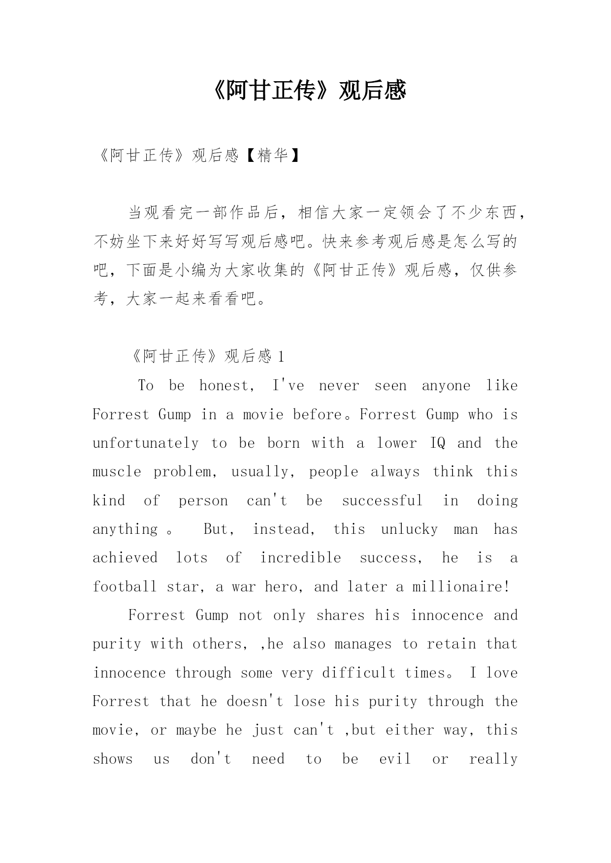 《阿甘正传》观后感《阿甘正传》观后感【精华】当观看完一部作品后,相信大家一定领会了不少东西,不妨坐下来好好写写观后感吧。快来参考观后感是怎么写的吧,下面是小编为大家收集的《阿甘正传》观后感,仅供参考,大家一起来看看吧。《阿甘正传》观后感1Tobehonest,I'veneverseenanyonelikeForrestGumpinamoviebefore。ForrestGumpwhoisunfortunatelytobebornwithalowerIQandthemuscleproblem,usually