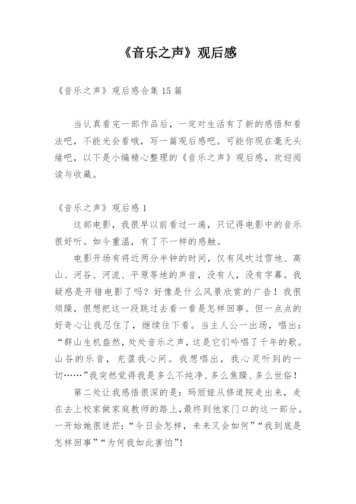 《音乐之声》观后感《音乐之声》观后感合集15篇当认真看完一部作品后,一定对生活有了新的感悟和看法吧,不能光会看哦,写一篇观后感吧。可能你现在毫无头绪吧,以下是小编精心整理的《音乐之声》观后感,欢迎阅读与收藏。《音乐之声》观后感1这部电影,我很早以前看过一遍,只记得电影中的音乐很好听。如今重温,有了不一样的感触。电影开场有将近两分半钟的时间,仅有风吹过雪地、高山、河谷、河流、平原等地的声音,没有人,没有字幕。我疑惑是开错电影了吗?好像是什么风景欣赏的广告!我很烦躁,很想把这一段跳过去看一看是怎样回事。但一点