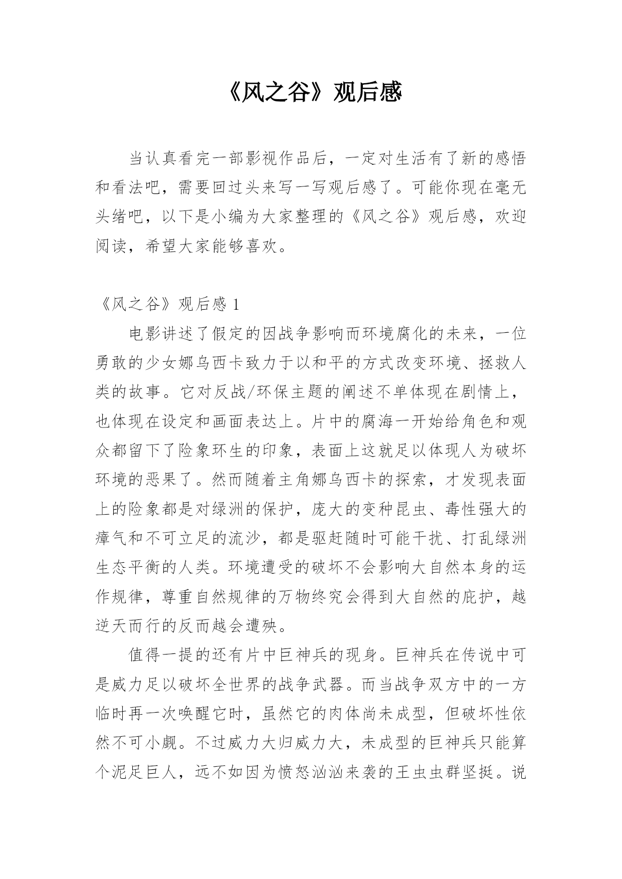 《风之谷》观后感当认真看完一部影视作品后,一定对生活有了新的感悟和看法吧,需要回过头来写一写观后感了。可能你现在毫无头绪吧,以下是小编为大家整理的《风之谷》观后感,欢迎阅读,希望大家能够喜欢。《风之谷》观后感1电影讲述了假定的因战争影响而环境腐化的未来,一位勇敢的少女娜乌西卡致力于以和平的方式改变环境、拯救人类的故事。它对反战/环保主题的阐述不单体现在剧情上,也体现在设定和画面表达上。片中的腐海一开始给角色和观众都留下了险象环生的印象,表面上这就足以体现人为破坏环境的恶果了。然而随着主角娜乌西卡的探索,才