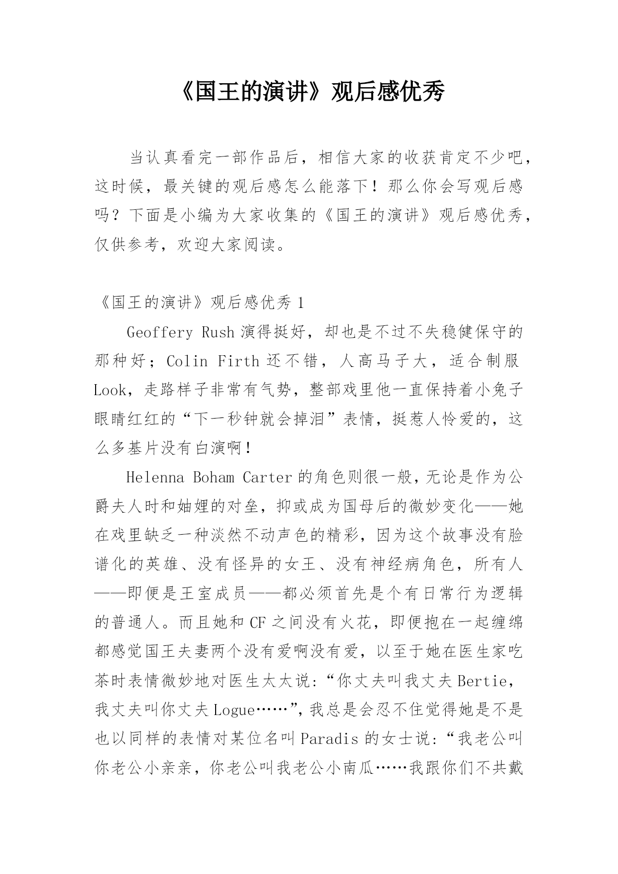 《国王的演讲》观后感优秀当认真看完一部作品后,相信大家的收获肯定不少吧,这时候,最关键的观后感怎么能落下!那么你会写观后感吗?下面是小编为大家收集的《国王的演讲》观后感优秀,仅供参考,欢迎大家阅读。《国王的演讲》观后感优秀1GeofferyRush演得挺好,却也是不过不失稳健保守的那种好;ColinFirth还不错,人高马子大,适合制服Look,走路样子非常有气势,整部戏里他一直保持着小兔子眼睛红红的“下一秒钟就会掉泪”表情,挺惹人怜爱的,这么多基片没有白演啊!HelennaBohamCarter的角色则