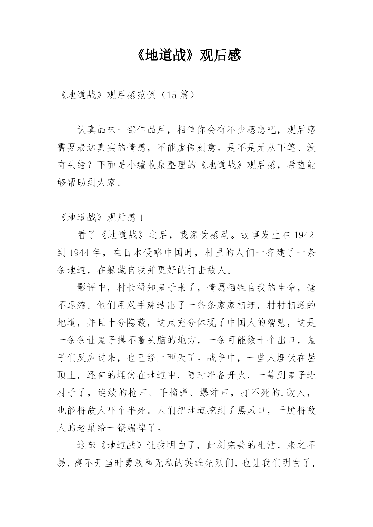《地道战》观后感《地道战》观后感范例(15篇)认真品味一部作品后,相信你会有不少感想吧,观后感需要表达真实的情感,不能虚假刻意。是不是无从下笔、没有头绪?下面是小编收集整理的《地道战》观后感,希望能够帮助到大家。《地道战》观后感1看了《地道战》之后,我深受感动。故事发生在1942到1944年,在日本侵略中国时,村里的人们一齐建了一条条地道,在躲藏自我并更好的打击敌人。影评中,村长得知鬼子来了,情愿牺牲自我的生命,毫不退缩。他们用双手建造出了一条条家家相连,村村相通的地道,并且十分隐蔽,这点充分体现了中国人