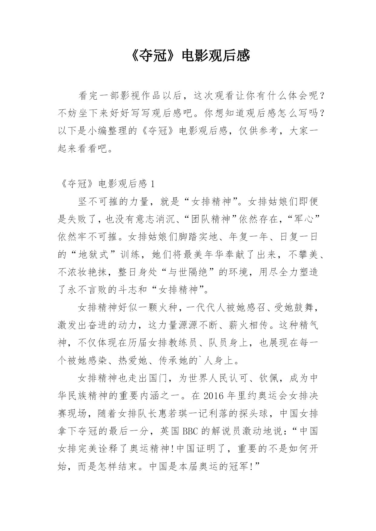 《夺冠》电影观后感看完一部影视作品以后,这次观看让你有什么体会呢?不妨坐下来好好写写观后感吧。你想知道观后感怎么写吗?以下是小编整理的《夺冠》电影观后感,仅供参考,大家一起来看看吧。《夺冠》电影观后感1坚不可摧的力量,就是“女排精神”。女排姑娘们即便是失败了,也没有意志消沉、“团队精神”依然存在,“军心”依然牢不可摧。女排姑娘们脚踏实地、年复一年、日复一日的“地狱式”训练,她们将最美年华奉献了出来,不攀美、不浓妆艳抹,整日身处“与世隔绝”的环境,用尽全力塑造了永不言败的斗志和“女排精神”。女排精神好似一颗
