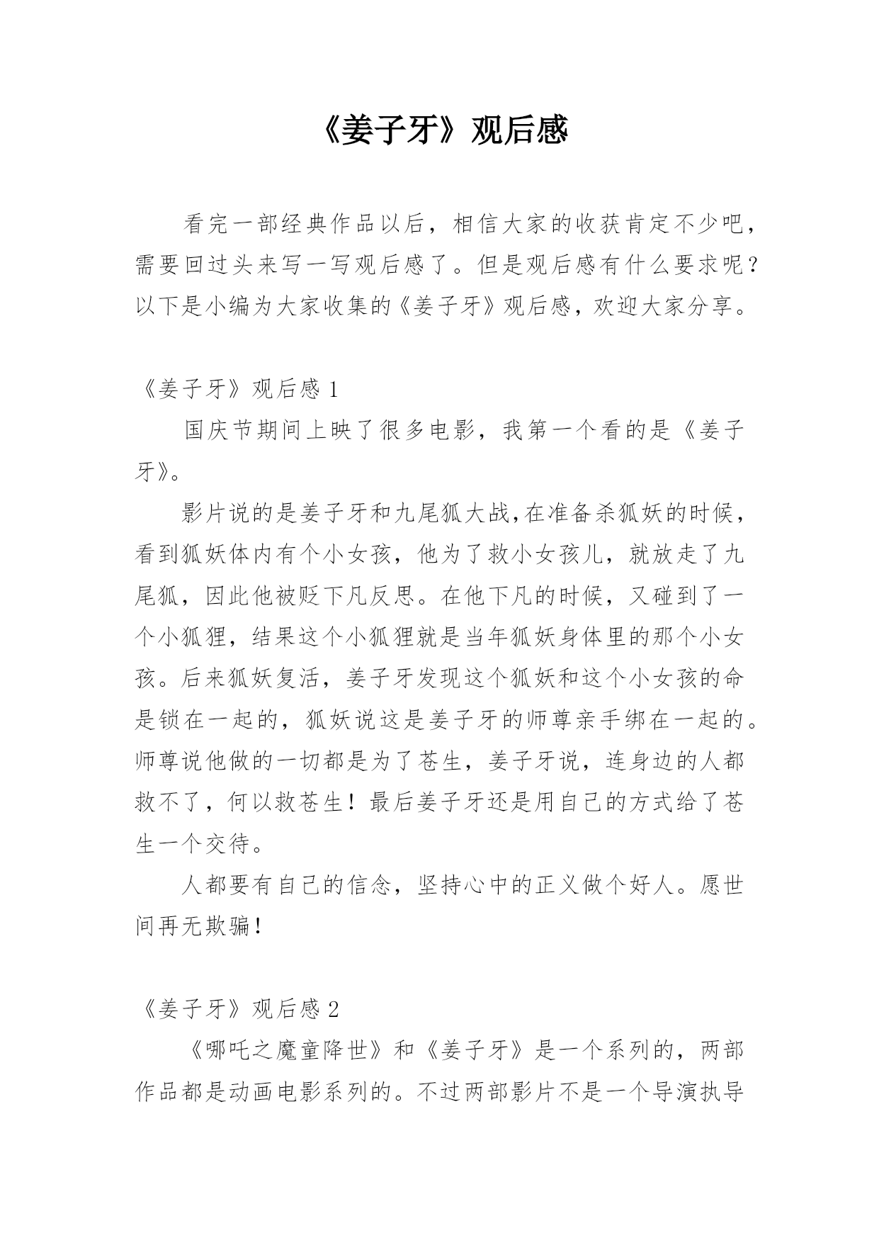 《姜子牙》观后感看完一部经典作品以后,相信大家的收获肯定不少吧,需要回过头来写一写观后感了。但是观后感有什么要求呢?以下是小编为大家收集的《姜子牙》观后感,欢迎大家分享。《姜子牙》观后感1国庆节期间上映了很多电影,我第一个看的是《姜子牙》。影片说的是姜子牙和九尾狐大战,在准备杀狐妖的时候,看到狐妖体内有个小女孩,他为了救小女孩儿,就放走了九尾狐,因此他被贬下凡反思。在他下凡的时候,又碰到了一个小狐狸,结果这个小狐狸就是当年狐妖身体里的那个小女孩。后来狐妖复活,姜子牙发现这个狐妖和这个小女孩的命是锁在一起的