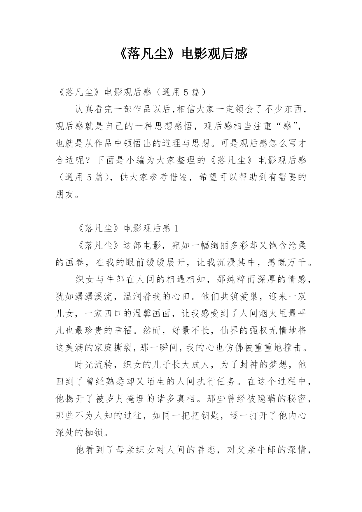 《落凡尘》电影观后感《落凡尘》电影观后感(通用5篇)认真看完一部作品以后,相信大家一定领会了不少东西,观后感就是自己的一种思想感悟,观后感相当注重“感”,也就是从作品中领悟出的道理与思想。可是观后感怎么写才合适呢?下面是小编为大家整理的《落凡尘》电影观后感(通用5篇),供大家参考借鉴,希望可以帮助到有需要的朋友。《落凡尘》电影观后感1《落凡尘》这部电影,宛如一幅绚丽多彩却又饱含沧桑的画卷,在我的眼前缓缓展开,让我沉浸其中,感慨万千。织女与牛郎在人间的相遇相知,那纯粹而深厚的情感,犹如潺潺溪流,温润着我的心