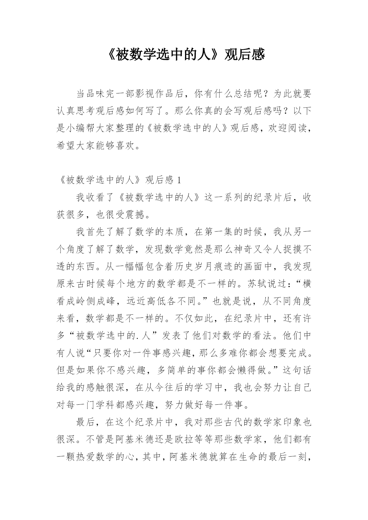 《被数学选中的人》观后感当品味完一部影视作品后,你有什么总结呢?为此就要认真思考观后感如何写了。那么你真的会写观后感吗?以下是小编帮大家整理的《被数学选中的人》观后感,欢迎阅读,希望大家能够喜欢。《被数学选中的人》观后感1我收看了《被数学选中的人》这一系列的纪录片后,收获很多,也很受震撼。我首先了解了数学的本质,在第一集的时候,我从另一个角度了解了数学,发现数学竟然是那么神奇又令人捉摸不透的东西。从一幅幅包含着历史岁月痕迹的画面中,我发现原来古时候每个地方的数学都是不一样的。苏轼说过:“横看成岭侧成峰,远