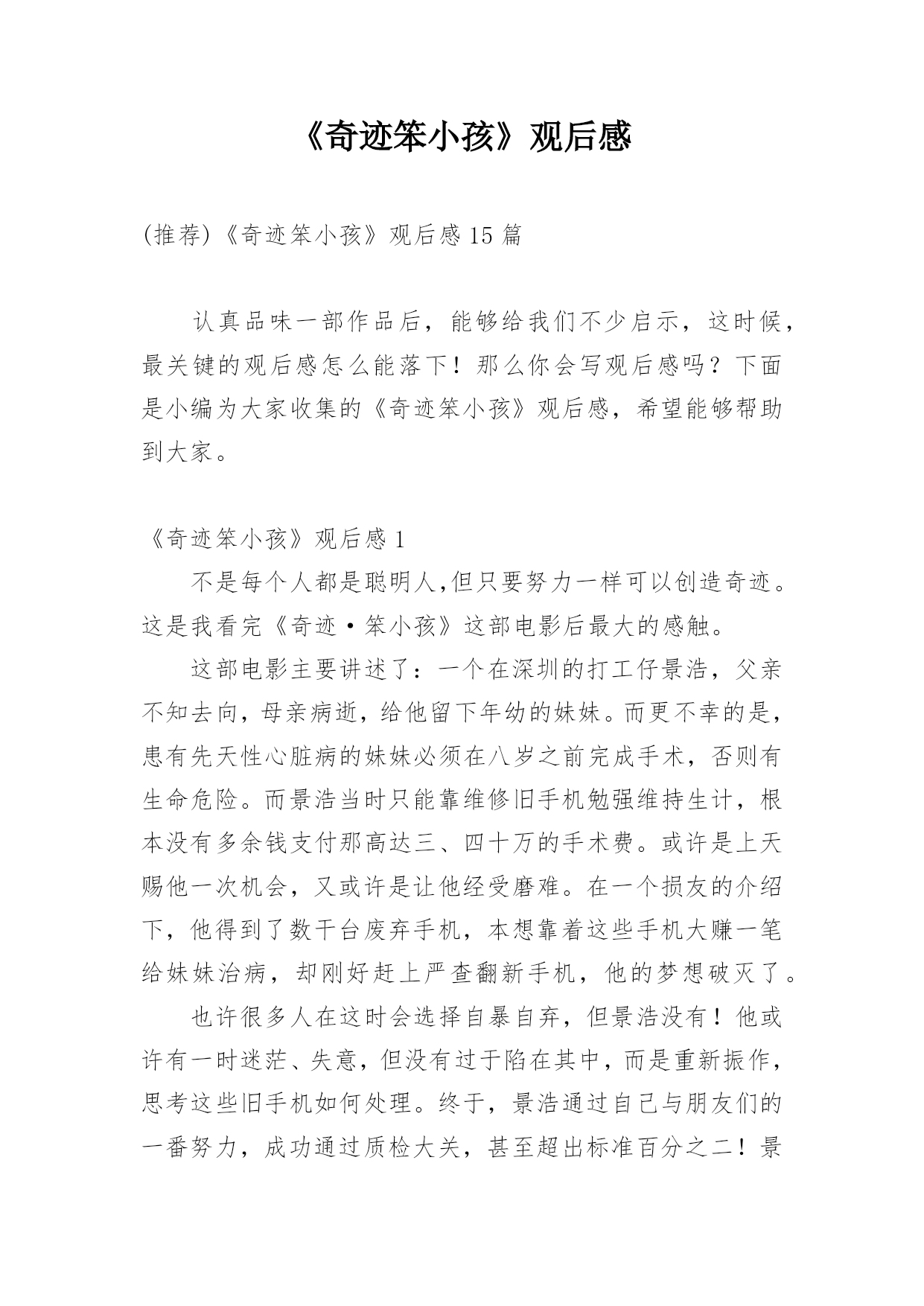 《奇迹笨小孩》观后感(推荐)《奇迹笨小孩》观后感15篇认真品味一部作品后,能够给我们不少启示,这时候,最关键的观后感怎么能落下!那么你会写观后感吗?下面是小编为大家收集的《奇迹笨小孩》观后感,希望能够帮助到大家。《奇迹笨小孩》观后感1不是每个人都是聪明人,但只要努力一样可以创造奇迹。这是我看完《奇迹·笨小孩》这部电影后最大的感触。这部电影主要讲述了:一个在深圳的打工仔景浩,父亲不知去向,母亲病逝,给他留下年幼的妹妹。而更不幸的是,患有先天性心脏病的妹妹必须在八岁之前完成手术,否则有生命危险。而景浩当时只能