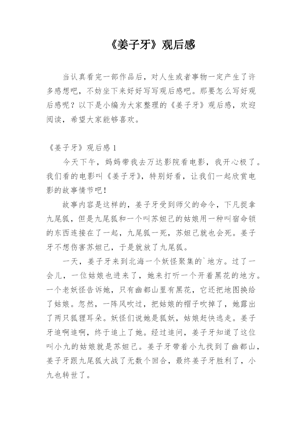 《姜子牙》观后感当认真看完一部作品后,对人生或者事物一定产生了许多感想吧,不妨坐下来好好写写观后感吧。那要怎么写好观后感呢?以下是小编为大家整理的《姜子牙》观后感,欢迎阅读,希望大家能够喜欢。《姜子牙》观后感1今天下午,妈妈带我去万达影院看电影,我开心极了。我们看的电影叫《姜子牙》,特别好看,让我们一起欣赏电影的故事情节吧!故事内容是这样的,姜子牙受到师父的命令,下凡捉拿九尾狐,但是九尾狐和一个叫苏妲己的姑娘用一种叫宿命锁的东西连接在了一起,九尾狐一死,苏妲己就也会死。姜子牙不想伤害苏妲己,于是就放了九尾
