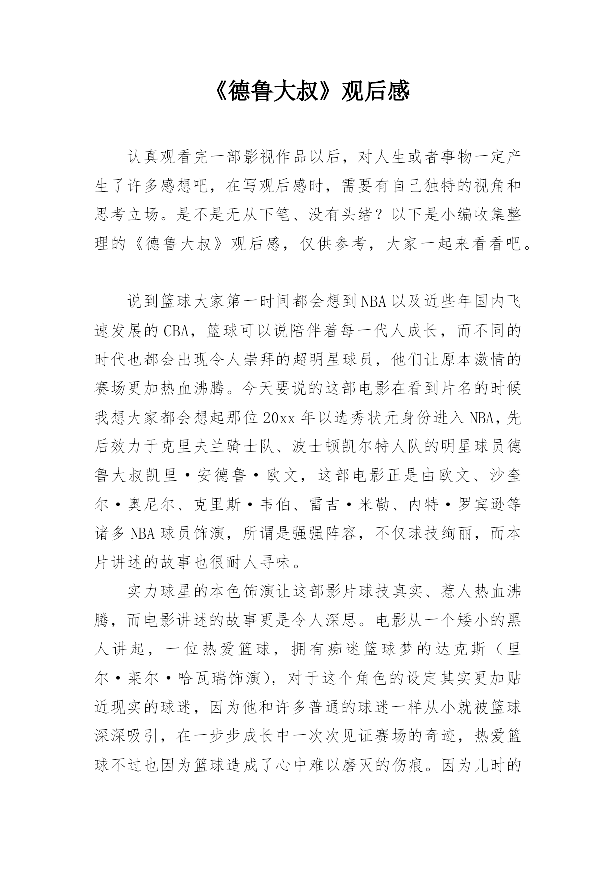 《德鲁大叔》观后感认真观看完一部影视作品以后,对人生或者事物一定产生了许多感想吧,在写观后感时,需要有自己独特的视角和思考立场。是不是无从下笔、没有头绪?以下是小编收集整理的《德鲁大叔》观后感,仅供参考,大家一起来看看吧。说到篮球大家第一时间都会想到NBA以及近些年国内飞速发展的CBA,篮球可以说陪伴着每一代人成长,而不同的时代也都会出现令人崇拜的超明星球员,他们让原本激情的赛场更加热血沸腾。今天要说的这部电影在看到片名的时候我想大家都会想起那位20xx年以选秀状元身份进入NBA,先后效力于克里夫兰骑士队