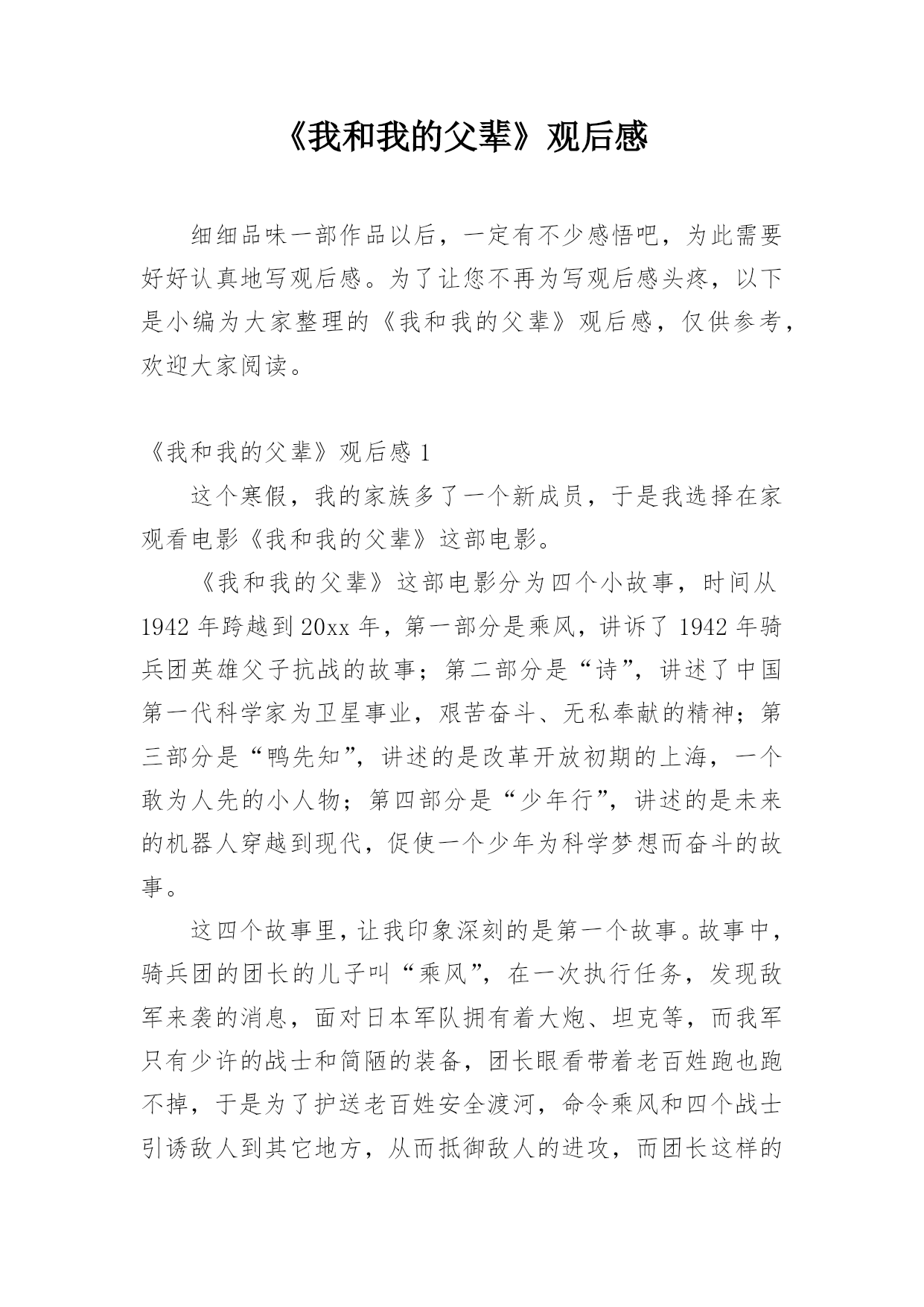 《我和我的父辈》观后感细细品味一部作品以后,一定有不少感悟吧,为此需要好好认真地写观后感。为了让您不再为写观后感头疼,以下是小编为大家整理的《我和我的父辈》观后感,仅供参考,欢迎大家阅读。《我和我的父辈》观后感1这个寒假,我的家族多了一个新成员,于是我选择在家观看电影《我和我的父辈》这部电影。《我和我的父辈》这部电影分为四个小故事,时间从1942年跨越到20xx年,第一部分是乘风,讲诉了1942年骑兵团英雄父子抗战的故事;第二部分是“诗”,讲述了中国第一代科学家为卫星事业,艰苦奋斗、无私奉献的精神;第三部
