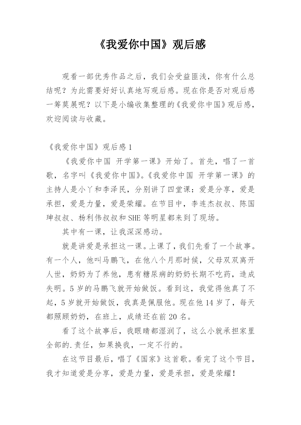 《我爱你中国》观后感观看一部优秀作品之后,我们会受益匪浅,你有什么总结呢?为此需要好好认真地写观后感。现在你是否对观后感一筹莫展呢?以下是小编收集整理的《我爱你中国》观后感,欢迎阅读与收藏。《我爱你中国》观后感1《我爱你中国开学第一课》开始了。首先,唱了一首歌,名字叫《我爱你中国》。《我爱你中国开学第一课》的主持人是小丫和李泽民,分别讲了四堂课:爱是分享,爱是承担,爱是力量,爱是荣耀。在节目中,李连杰叔叔、陈国珅叔叔、杨利伟叔叔和SHE等明星都来到了现场。其中有一课,让我深深感动。就是讲爱是承担这一课。上