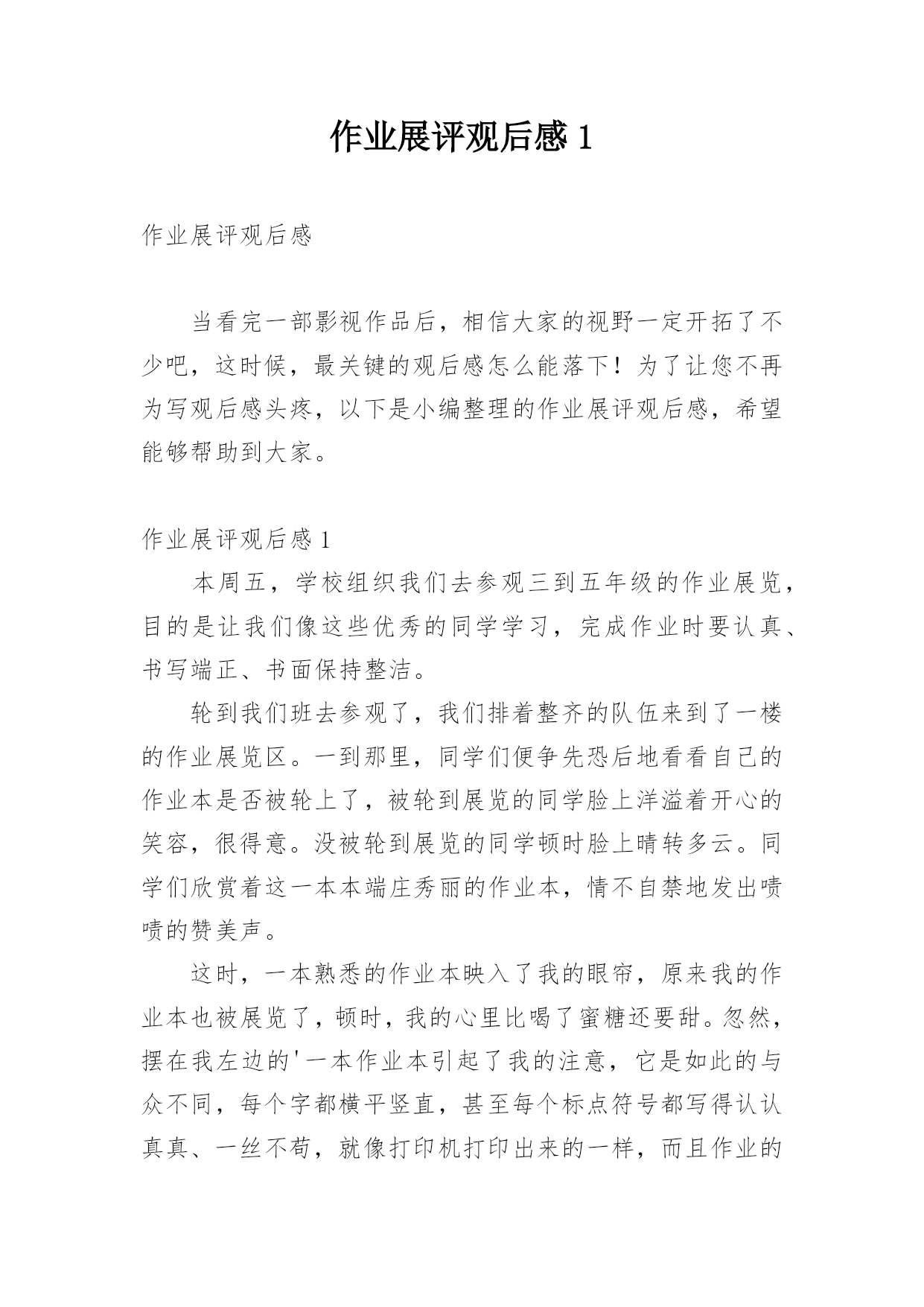 作业展评观后感1作业展评观后感当看完一部影视作品后,相信大家的视野一定开拓了不少吧,这时候,最关键的观后感怎么能落下!为了让您不再为写观后感头疼,以下是小编整理的作业展评观后感,希望能够帮助到大家。作业展评观后感1本周五,学校组织我们去参观三到五年级的作业展览,目的是让我们像这些优秀的同学学习,完成作业时要认真、书写端正、书面保持整洁。轮到我们班去参观了,我们排着整齐的队伍来到了一楼的作业展览区。一到那里,同学们便争先恐后地看看自己的作业本是否被轮上了,被轮到展览的同学脸上洋溢着开心的笑容,很得意。没被轮