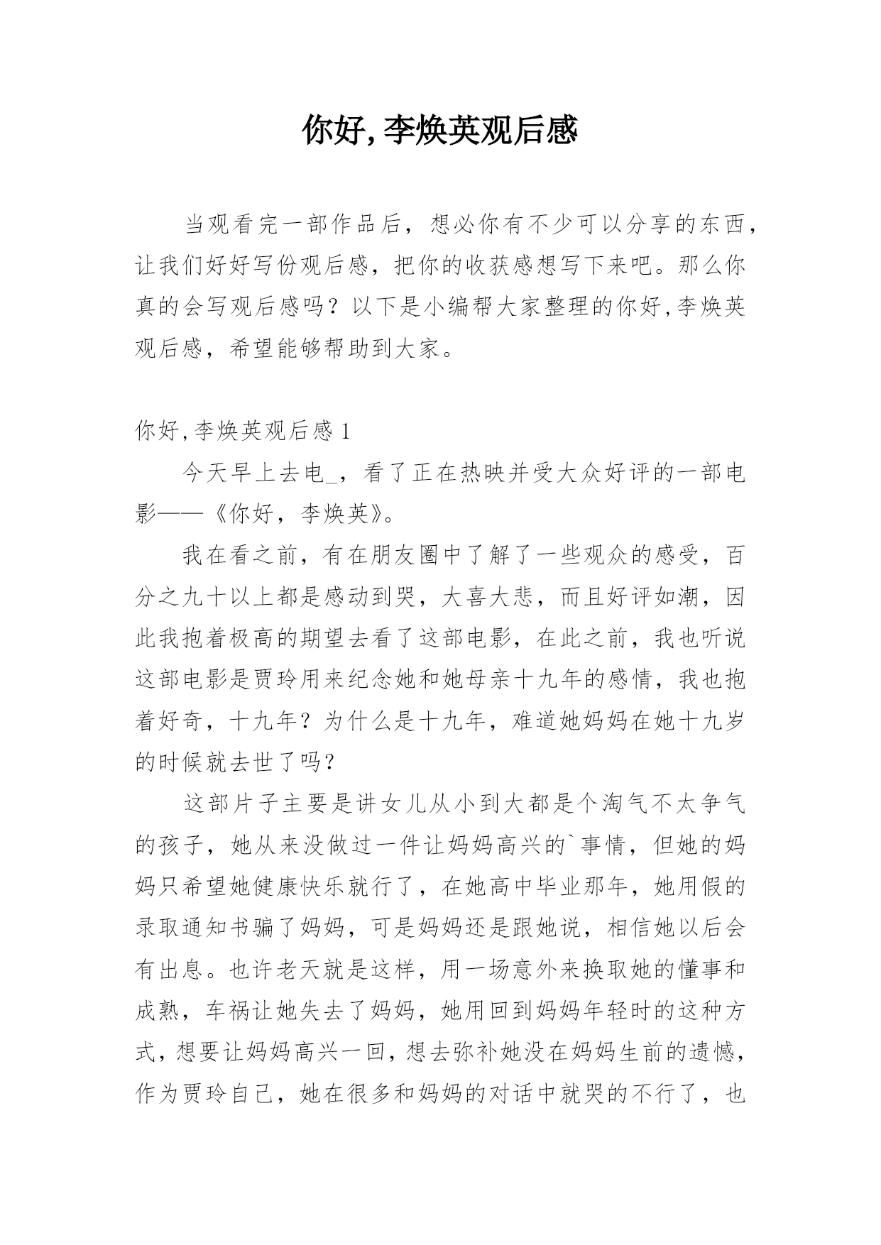 你好,李焕英观后感当观看完一部作品后,想必你有不少可以分享的东西,让我们好好写份观后感,把你的收获感想写下来吧。那么你真的会写观后感吗?以下是小编帮大家整理的你好,李焕英观后感,希望能够帮助到大家。你好,李焕英观后感1今天早上去电_,看了正在热映并受大众好评的一部电影——《你好,李焕英》。我在看之前,有在朋友圈中了解了一些观众的感受,百分之九十以上都是感动到哭,大喜大悲,而且好评如潮,因此我抱着极高的期望去看了这部电影,在此之前,我也听说这部电影是贾玲用来纪念她和她母亲十九年的感情,我也抱着好奇,十九年?