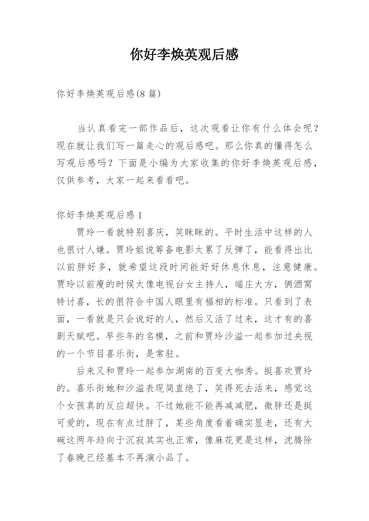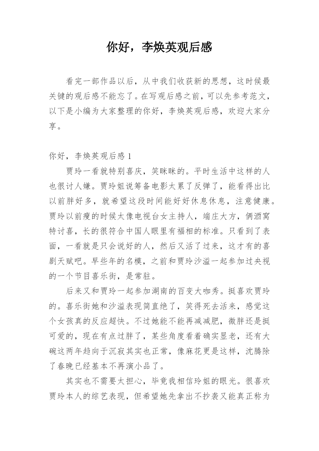 你好,李焕英观后感看完一部作品以后,从中我们收获新的思想,这时候最关键的观后感不能忘了。在写观后感之前,可以先参考范文,以下是小编为大家整理的你好,李焕英观后感,欢迎大家分享。你好,李焕英观后感1贾玲一看就特别喜庆,笑眯眯的。平时生活中这样的人也很讨人嫌。贾玲姐说筹备电影太累了反弹了,能看得出比以前胖好多,就希望这段时间能好好休息休息,注意健康。贾玲以前瘦的时候太像电视台女主持人,端庄大方,俩酒窝特讨喜,长的很符合中国人眼里有福相的标准。只看到了表面,一看就是只会说好的人,然后又活了过来,这才有的喜剧天赋