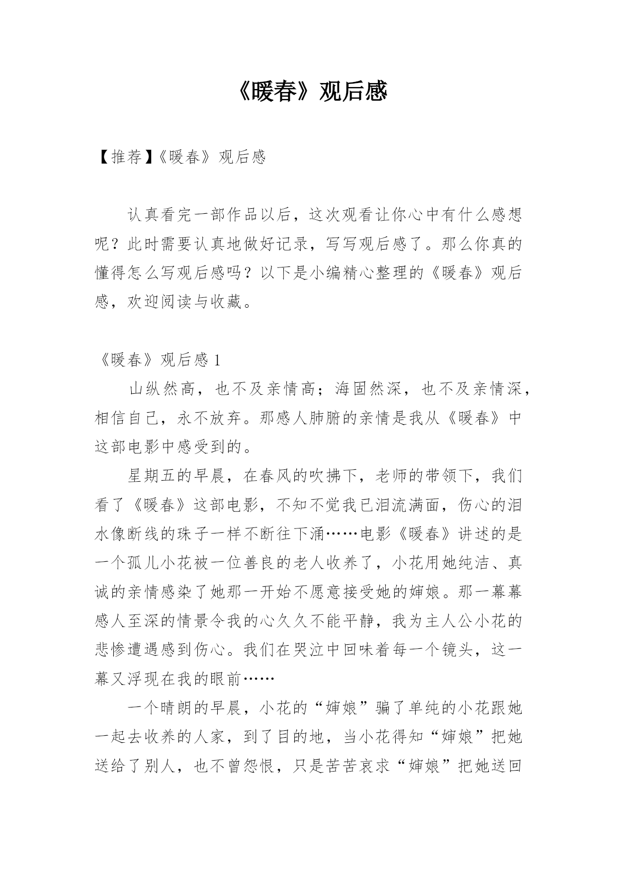 《暖春》观后感【推荐】《暖春》观后感认真看完一部作品以后,这次观看让你心中有什么感想呢?此时需要认真地做好记录,写写观后感了。那么你真的懂得怎么写观后感吗?以下是小编精心整理的《暖春》观后感,欢迎阅读与收藏。《暖春》观后感1山纵然高,也不及亲情高;海固然深,也不及亲情深,相信自己,永不放弃。那感人肺腑的亲情是我从《暖春》中这部电影中感受到的。星期五的早晨,在春风的吹拂下,老师的带领下,我们看了《暖春》这部电影,不知不觉我已泪流满面,伤心的泪水像断线的珠子一样不断往下涌……电影《暖春》讲述的是一个孤儿小花被