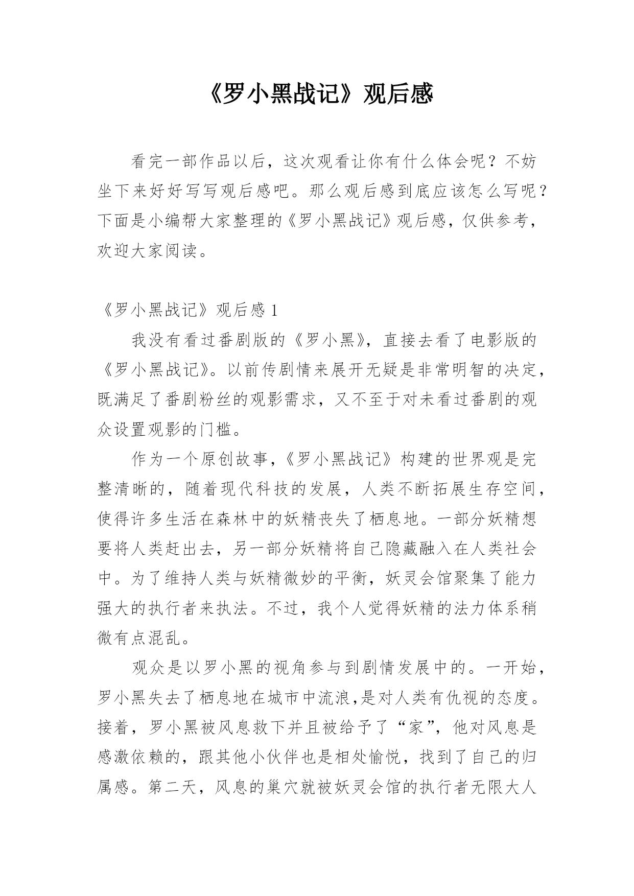 《罗小黑战记》观后感看完一部作品以后,这次观看让你有什么体会呢?不妨坐下来好好写写观后感吧。那么观后感到底应该怎么写呢?下面是小编帮大家整理的《罗小黑战记》观后感,仅供参考,欢迎大家阅读。《罗小黑战记》观后感1我没有看过番剧版的《罗小黑》,直接去看了电影版的《罗小黑战记》。以前传剧情来展开无疑是非常明智的决定,既满足了番剧粉丝的观影需求,又不至于对未看过番剧的观众设置观影的门槛。作为一个原创故事,《罗小黑战记》构建的世界观是完整清晰的,随着现代科技的发展,人类不断拓展生存空间,使得许多生活在森林中的妖精丧