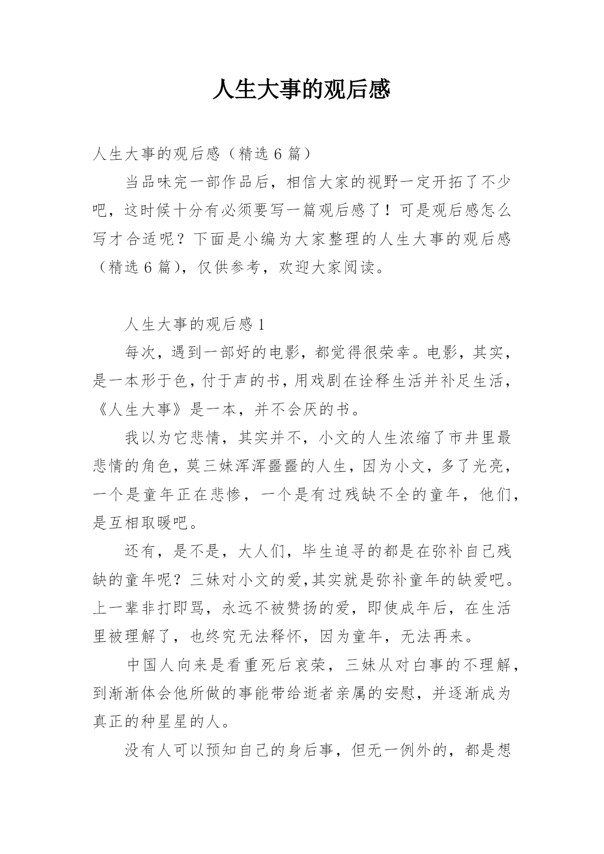 人生大事的观后感人生大事的观后感(精选6篇)当品味完一部作品后,相信大家的视野一定开拓了不少吧,这时候十分有必须要写一篇观后感了!可是观后感怎么写才合适呢?下面是小编为大家整理的人生大事的观后感(精选6篇),仅供参考,欢迎大家阅读。人生大事的观后感1每次,遇到一部好的电影,都觉得很荣幸。电影,其实,是一本形于色,付于声的书,用戏剧在诠释生活并补足生活,《人生大事》是一本,并不会厌的书。我以为它悲情,其实并不,小文的人生浓缩了市井里最悲情的角色,莫三妹浑浑噩噩的人生,因为小文,多了光亮,一个是童年正在悲惨,