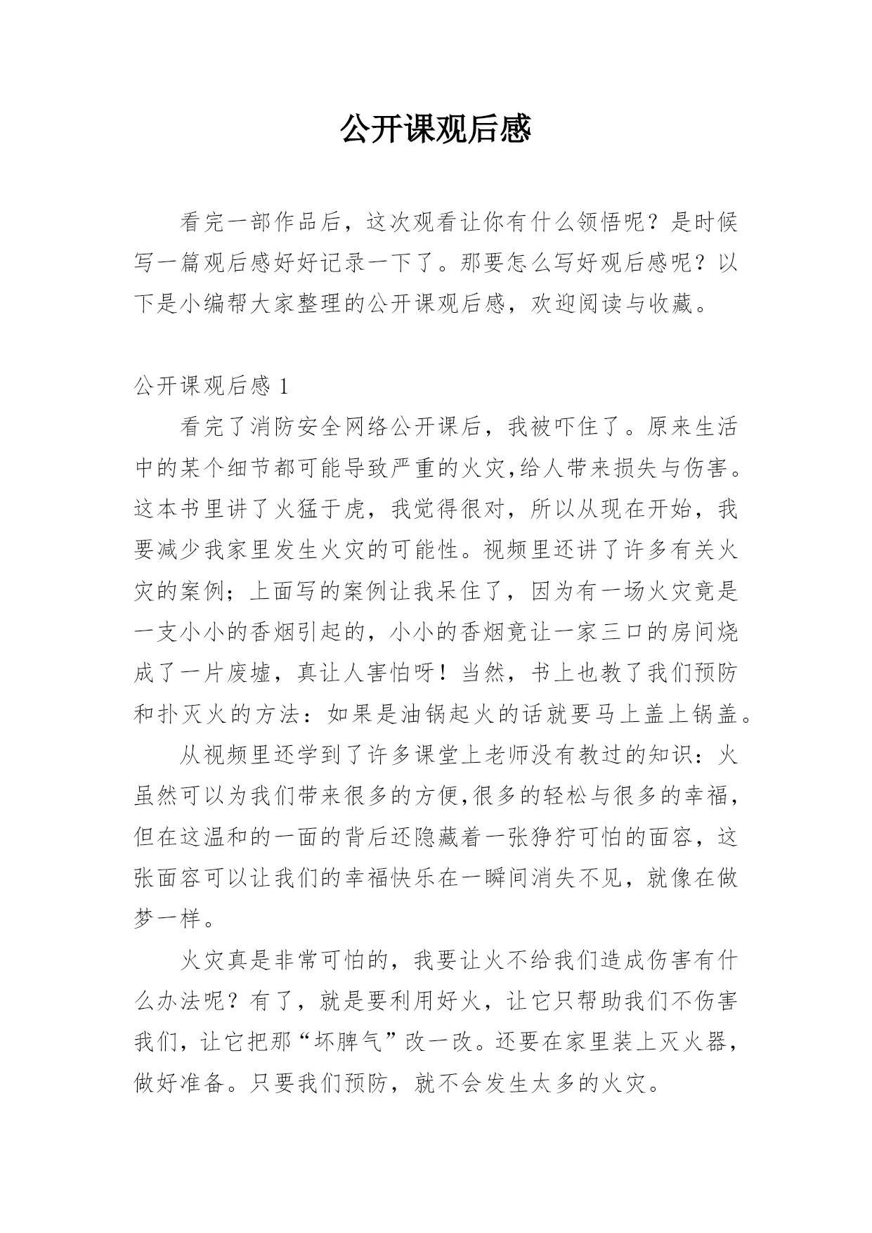 公开课观后感看完一部作品后,这次观看让你有什么领悟呢?是时候写一篇观后感好好记录一下了。那要怎么写好观后感呢?以下是小编帮大家整理的公开课观后感,欢迎阅读与收藏。公开课观后感1看完了消防安全网络公开课后,我被吓住了。原来生活中的某个细节都可能导致严重的火灾,给人带来损失与伤害。这本书里讲了火猛于虎,我觉得很对,所以从现在开始,我要减少我家里发生火灾的可能性。视频里还讲了许多有关火灾的案例;上面写的案例让我呆住了,因为有一场火灾竟是一支小小的香烟引起的,小小的香烟竟让一家三口的房间烧成了一片废墟,真让人害怕