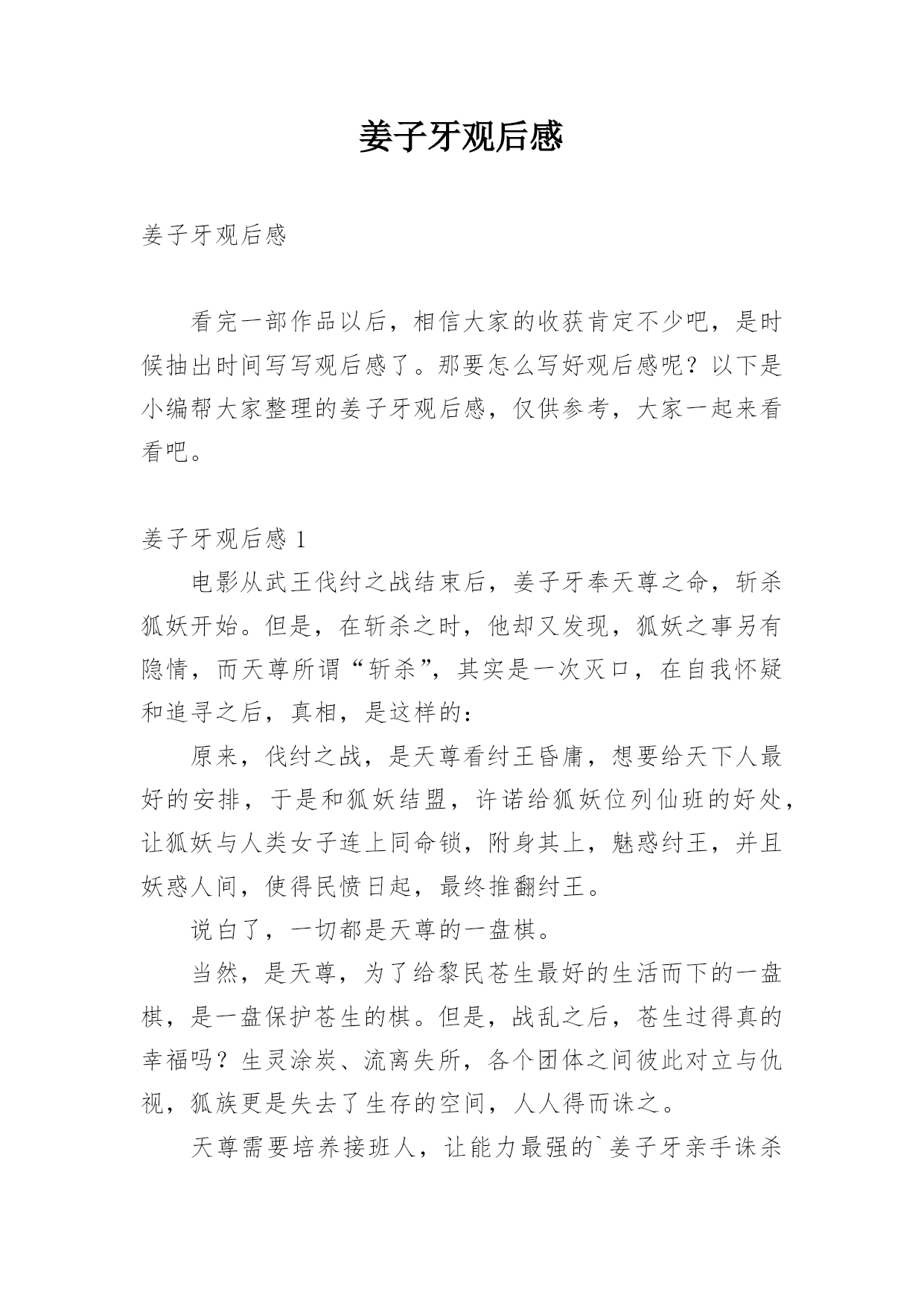 姜子牙观后感姜子牙观后感看完一部作品以后,相信大家的收获肯定不少吧,是时候抽出时间写写观后感了。那要怎么写好观后感呢?以下是小编帮大家整理的姜子牙观后感,仅供参考,大家一起来看看吧。姜子牙观后感1电影从武王伐纣之战结束后,姜子牙奉天尊之命,斩杀狐妖开始。但是,在斩杀之时,他却又发现,狐妖之事另有隐情,而天尊所谓“斩杀”,其实是一次灭口,在自我怀疑和追寻之后,真相,是这样的:原来,伐纣之战,是天尊看纣王昏庸,想要给天下人最好的安排,于是和狐妖结盟,许诺给狐妖位列仙班的好处,让狐妖与人类女子连上同命锁,附身其