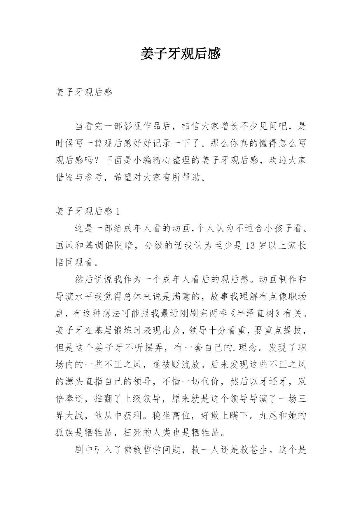 姜子牙观后感姜子牙观后感当看完一部影视作品后,相信大家增长不少见闻吧,是时候写一篇观后感好好记录一下了。那么你真的懂得怎么写观后感吗?下面是小编精心整理的姜子牙观后感,欢迎大家借鉴与参考,希望对大家有所帮助。姜子牙观后感1这是一部给成年人看的动画,个人认为不适合小孩子看。画风和基调偏阴暗,分级的话我认为至少是13岁以上家长陪同观看。然后说说我作为一个成年人看后的观后感。动画制作和导演水平我觉得总体来说是满意的,故事我理解有点像职场剧,有这种想法可能跟我最近刚刷完两季《半泽直树》有关。姜子牙在基层锻炼时表现