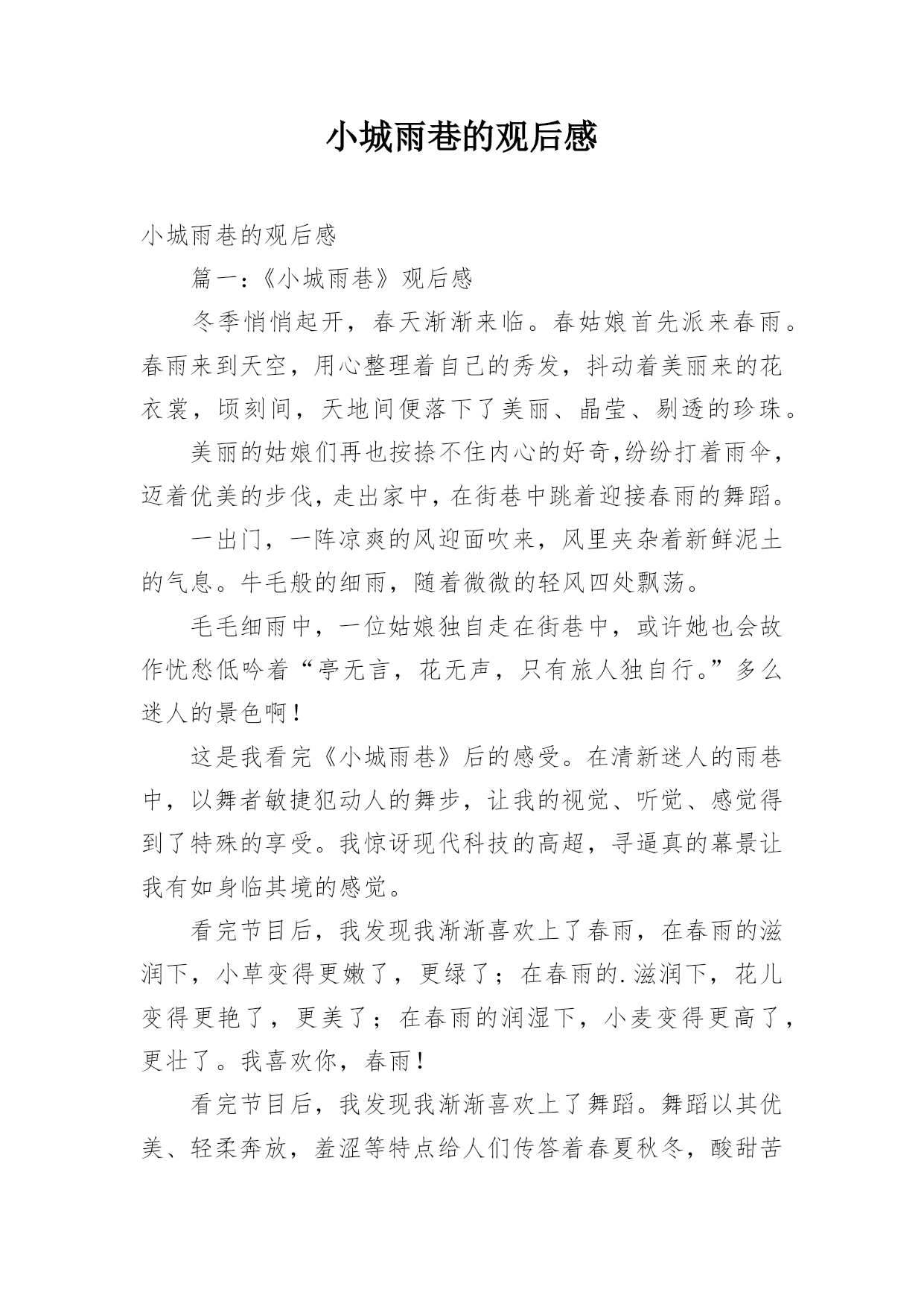 小城雨巷的观后感小城雨巷的观后感篇一:《小城雨巷》观后感冬季悄悄起开,春天渐渐来临。春姑娘首先派来春雨。春雨来到天空,用心整理着自己的秀发,抖动着美丽来的花衣裳,顷刻间,天地间便落下了美丽、晶莹、剔透的珍珠。美丽的姑娘们再也按捺不住内心的好奇,纷纷打着雨伞,迈着优美的步伐,走出家中,在街巷中跳着迎接春雨的舞蹈。一出门,一阵凉爽的风迎面吹来,风里夹杂着新鲜泥土的气息。牛毛般的细雨,随着微微的轻风四处飘荡。毛毛细雨中,一位姑娘独自走在街巷中,或许她也会故作忧愁低吟着“亭无言,花无声,只有旅人独自行。”多么迷人
