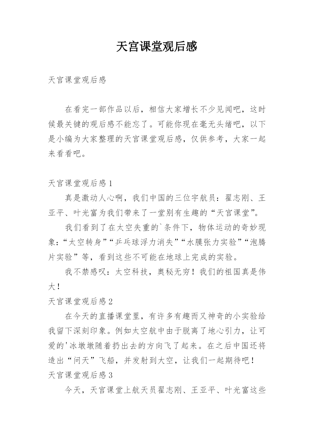 天宫课堂观后感天宫课堂观后感在看完一部作品以后,相信大家增长不少见闻吧,这时候最关键的观后感不能忘了。可能你现在毫无头绪吧,以下是小编为大家整理的天宫课堂观后感,仅供参考,大家一起来看看吧。天宫课堂观后感1真是激动人心啊,我们中国的三位宇航员:翟志刚、王亚平、叶光富为我们带来了一堂别有生趣的“天宫课堂”。我们看到了在太空失重的`条件下,物体运动的奇妙现象:“太空转身”“乒乓球浮力消失”“水膜张力实验”“泡腾片实验”等,看到这些不可能在地球上完成的实验。我不禁感叹:太空科技,奥秘无穷!我们的祖国真是伟大!天