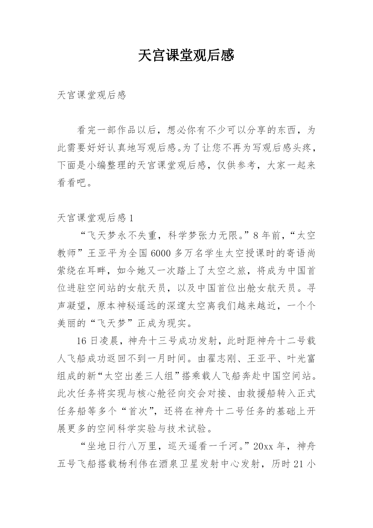 天宫课堂观后感天宫课堂观后感看完一部作品以后,想必你有不少可以分享的东西,为此需要好好认真地写观后感。为了让您不再为写观后感头疼,下面是小编整理的天宫课堂观后感,仅供参考,大家一起来看看吧。天宫课堂观后感1“飞天梦永不失重,科学梦张力无限。”8年前,“太空教师”王亚平为全国6000多万名学生太空授课时的寄语尚萦绕在耳畔,如今她又一次踏上了太空之旅,将成为中国首位进驻空间站的女航天员,以及中国首位出舱女航天员。寻声凝望,原本神秘遥远的深邃太空离我们越来越近,一个个美丽的“飞天梦”正成为现实。16日凌晨,神舟