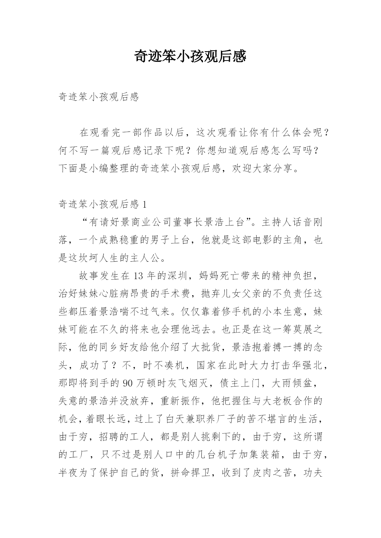 奇迹笨小孩观后感奇迹笨小孩观后感在观看完一部作品以后,这次观看让你有什么体会呢?何不写一篇观后感记录下呢?你想知道观后感怎么写吗?下面是小编整理的奇迹笨小孩观后感,欢迎大家分享。奇迹笨小孩观后感1“有请好景商业公司董事长景浩上台”。主持人话音刚落,一个成熟稳重的男子上台,他就是这部电影的主角,也是这坎坷人生的主人公。故事发生在13年的深圳,妈妈死亡带来的精神负担,治好妹妹心脏病昂贵的手术费,抛弃儿女父亲的不负责任这些都压着景浩喘不过气来。仅仅靠着修手机的小本生意,妹妹可能在不久的将来也会理他远去。也正是在