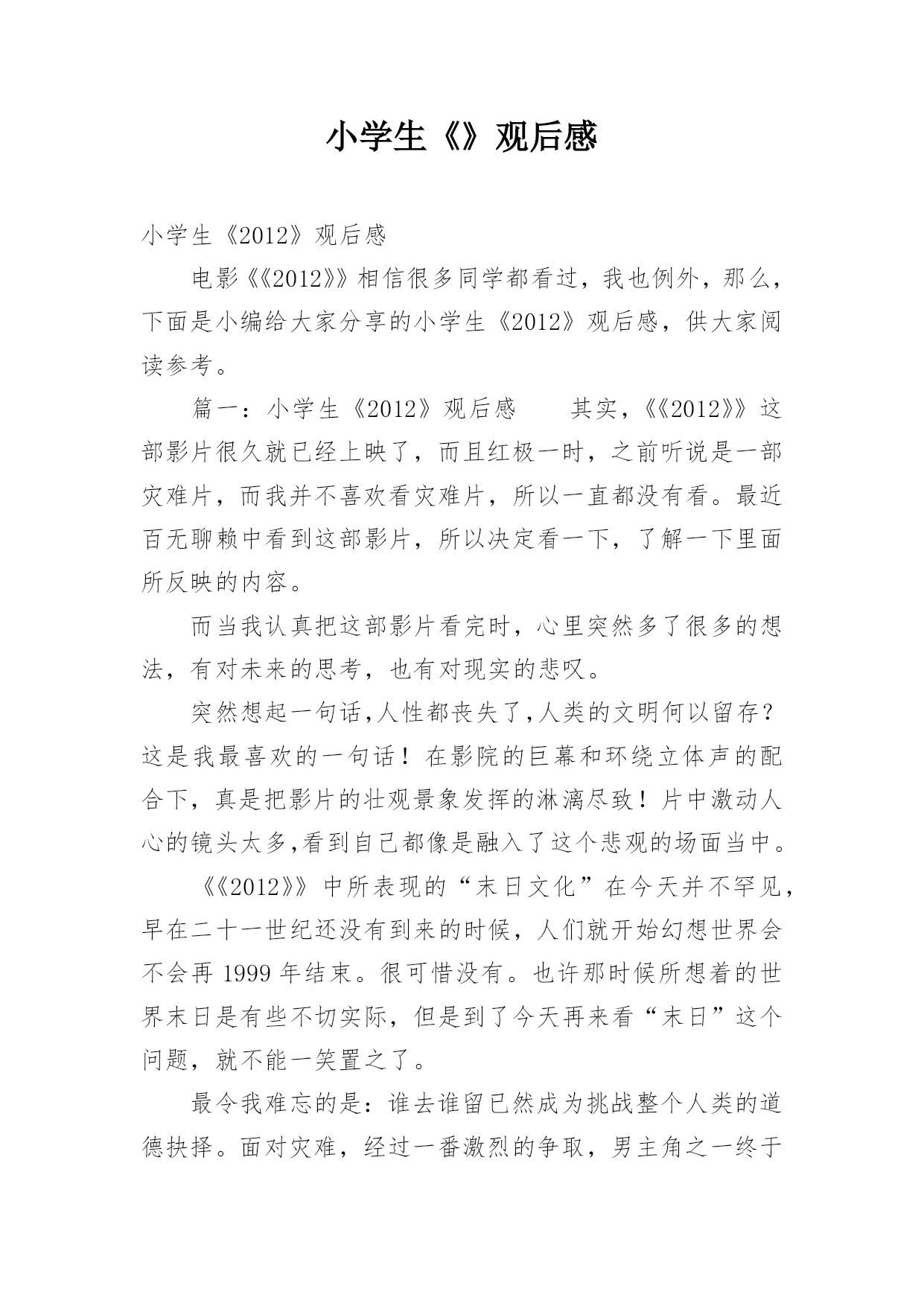 小学生《》观后感小学生《2012》观后感电影《《2012》》相信很多同学都看过,我也例外,那么,下面是小编给大家分享的小学生《2012》观后感,供大家阅读参考。篇一:小学生《2012》观后感其实,《《2012》》这部影片很久就已经上映了,而且红极一时,之前听说是一部灾难片,而我并不喜欢看灾难片,所以一直都没有看。最近百无聊赖中看到这部影片,所以决定看一下,了解一下里面所反映的内容。而当我认真把这部影片看完时,心里突然多了很多的想法,有对未来的思考,也有对现实的悲叹。突然想起一句话,人性都丧失了,人类的文明