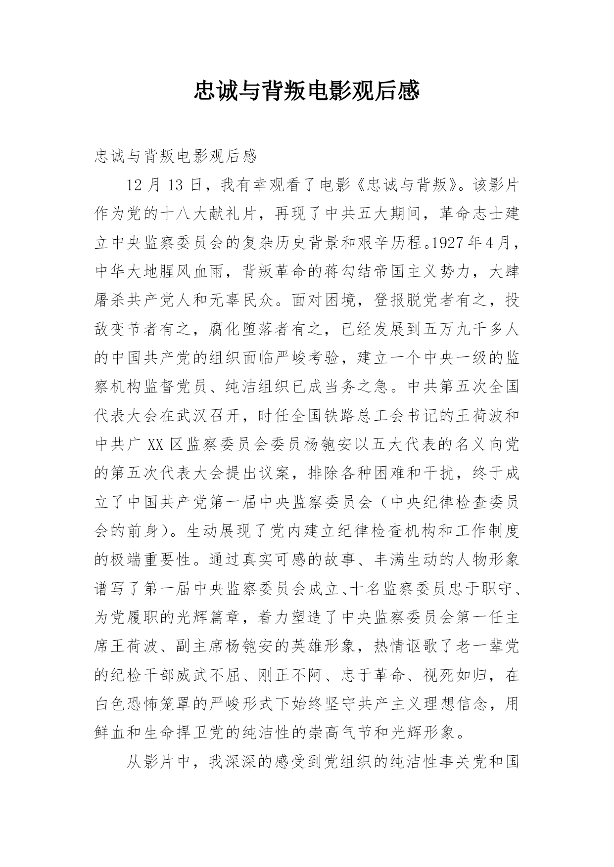 忠诚与背叛电影观后感忠诚与背叛电影观后感12月13日,我有幸观看了电影《忠诚与背叛》。该影片作为党的十八大献礼片,再现了中共五大期间,革命志士建立中央监察委员会的复杂历史背景和艰辛历程。1927年4月,中华大地腥风血雨,背叛革命的蒋勾结帝国主义势力,大肆屠杀共产党人和无辜民众。面对困境,登报脱党者有之,投敌变节者有之,腐化堕落者有之,已经发展到五万九千多人的中国共产党的组织面临严峻考验,建立一个中央一级的监察机构监督党员、纯洁组织已成当务之急。中共第五次全国代表大会在武汉召开,时任全国铁路总工会书记的王荷