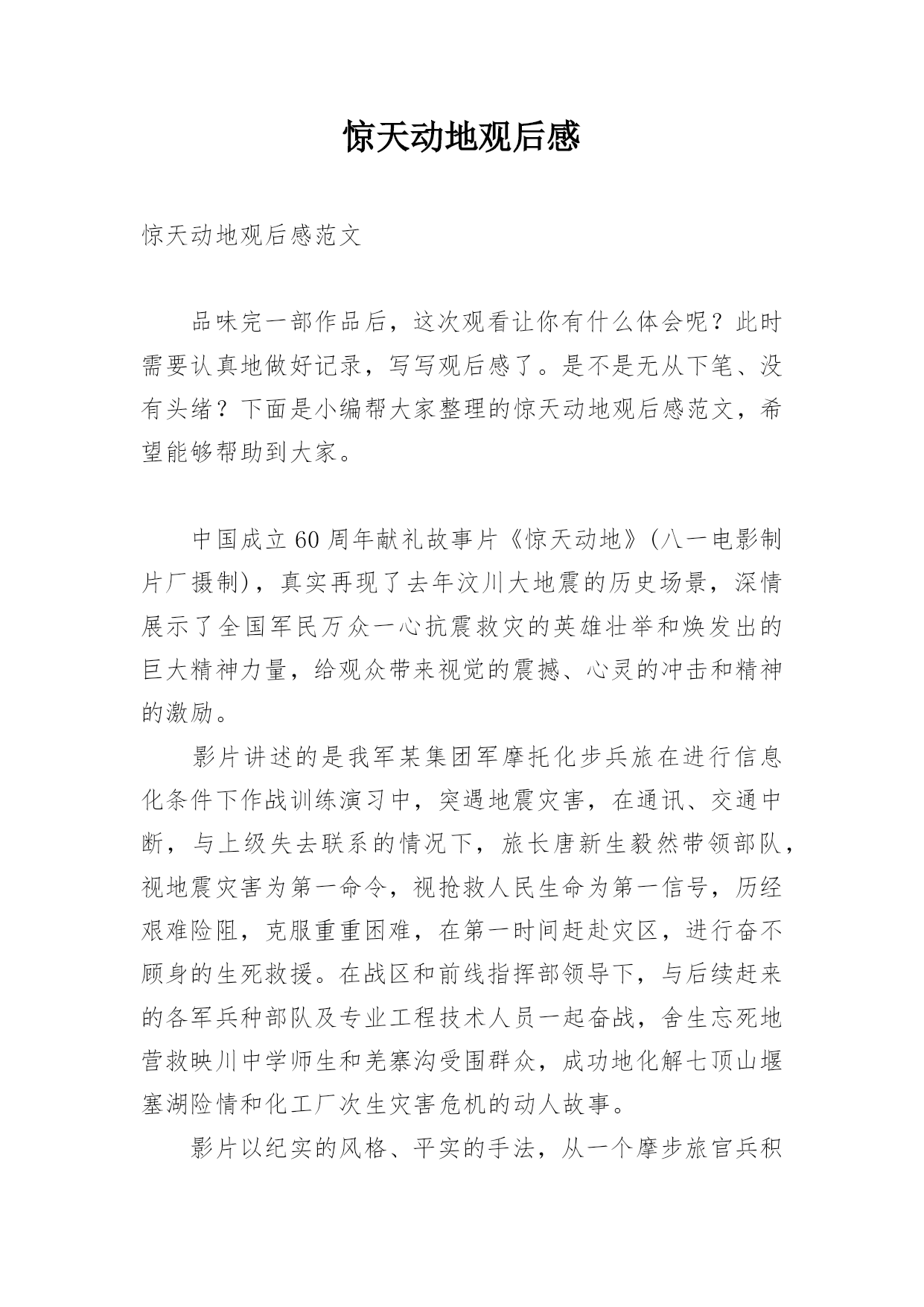 惊天动地观后感惊天动地观后感范文品味完一部作品后,这次观看让你有什么体会呢?此时需要认真地做好记录,写写观后感了。是不是无从下笔、没有头绪?下面是小编帮大家整理的惊天动地观后感范文,希望能够帮助到大家。中国成立60周年献礼故事片《惊天动地》(八一电影制片厂摄制),真实再现了去年汶川大地震的历史场景,深情展示了全国军民万众一心抗震救灾的英雄壮举和焕发出的巨大精神力量,给观众带来视觉的震撼、心灵的冲击和精神的激励。影片讲述的是我军某集团军摩托化步兵旅在进行信息化条件下作战训练演习中,突遇地震灾害,在通讯、交通