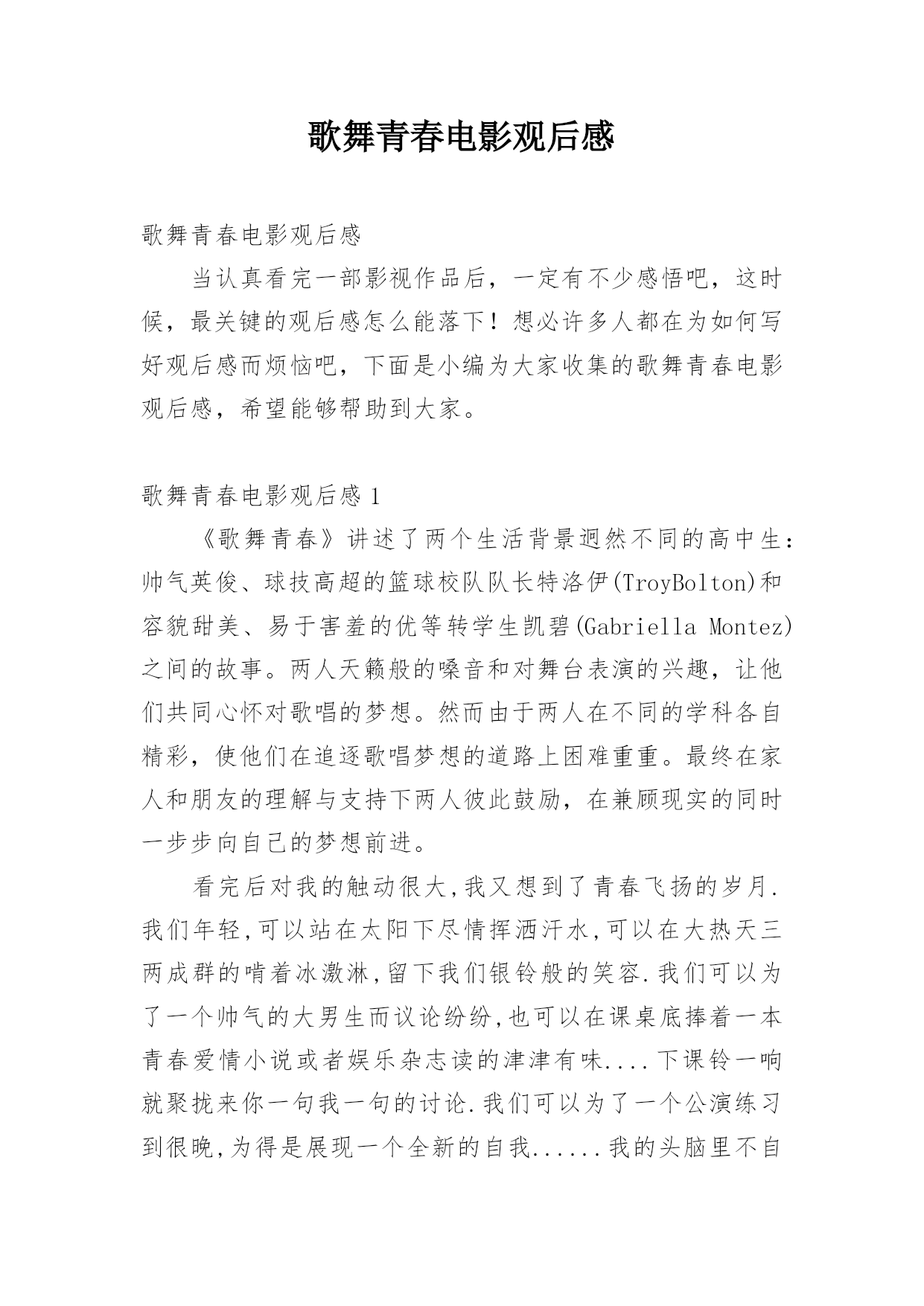 歌舞青春电影观后感歌舞青春电影观后感当认真看完一部影视作品后,一定有不少感悟吧,这时候,最关键的观后感怎么能落下!想必许多人都在为如何写好观后感而烦恼吧,下面是小编为大家收集的歌舞青春电影观后感,希望能够帮助到大家。歌舞青春电影观后感1《歌舞青春》讲述了两个生活背景迥然不同的高中生:帅气英俊、球技高超的篮球校队队长特洛伊(TroyBolton)和容貌甜美、易于害羞的优等转学生凯碧(GabriellaMontez)之间的故事。两人天籁般的嗓音和对舞台表演的兴趣,让他们共同心怀对歌唱的梦想。然而由于两人在不同