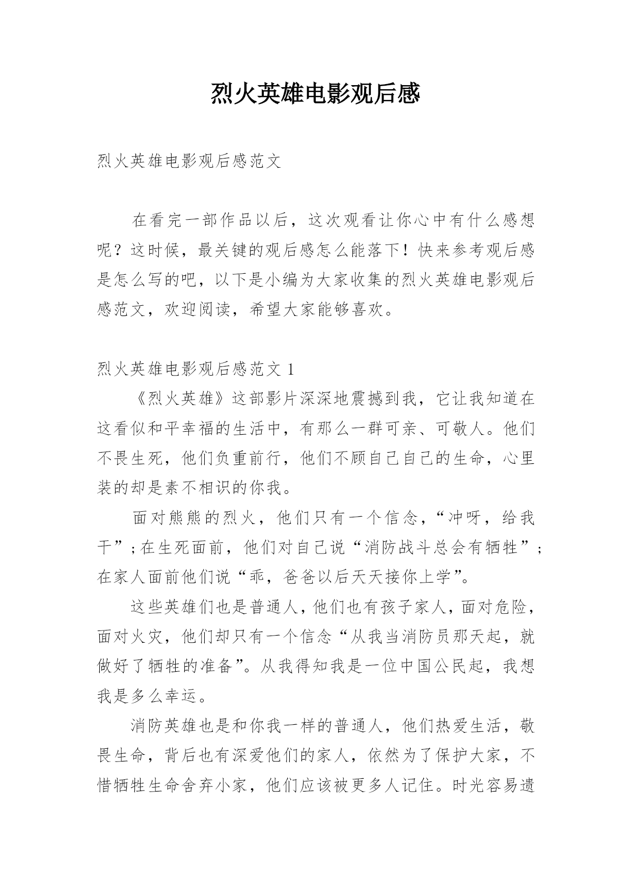 烈火英雄电影观后感烈火英雄电影观后感范文在看完一部作品以后,这次观看让你心中有什么感想呢?这时候,最关键的观后感怎么能落下!快来参考观后感是怎么写的吧,以下是小编为大家收集的烈火英雄电影观后感范文,欢迎阅读,希望大家能够喜欢。烈火英雄电影观后感范文1《烈火英雄》这部影片深深地震撼到我,它让我知道在这看似和平幸福的生活中,有那么一群可亲、可敬人。他们不畏生死,他们负重前行,他们不顾自己自己的生命,心里装的却是素不相识的你我。面对熊熊的烈火,他们只有一个信念,“冲呀,给我干”;在生死面前,他们对自己说“消防战