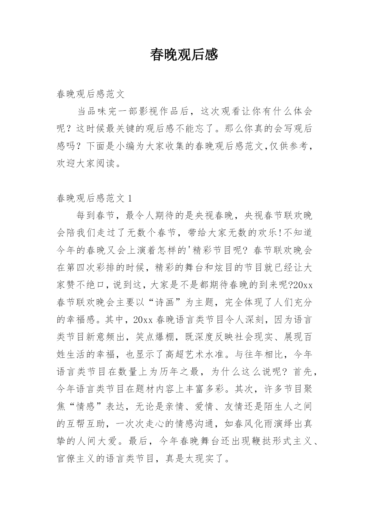 春晚观后感春晚观后感范文当品味完一部影视作品后,这次观看让你有什么体会呢?这时候最关键的观后感不能忘了。那么你真的会写观后感吗?下面是小编为大家收集的春晚观后感范文,仅供参考,欢迎大家阅读。春晚观后感范文1每到春节,最令人期待的是央视春晚,央视春节联欢晚会陪我们走过了无数个春节,带给大家无数的欢乐!不知道今年的春晚又会上演着怎样的'精彩节目呢?春节联欢晚会在第四次彩排的时候,精彩的舞台和炫目的节目就已经让大家赞不绝口,说到这,大家是不是都期待春晚的到来呢?20xx春节联欢晚会主要以“诗画”为主题,完全体现