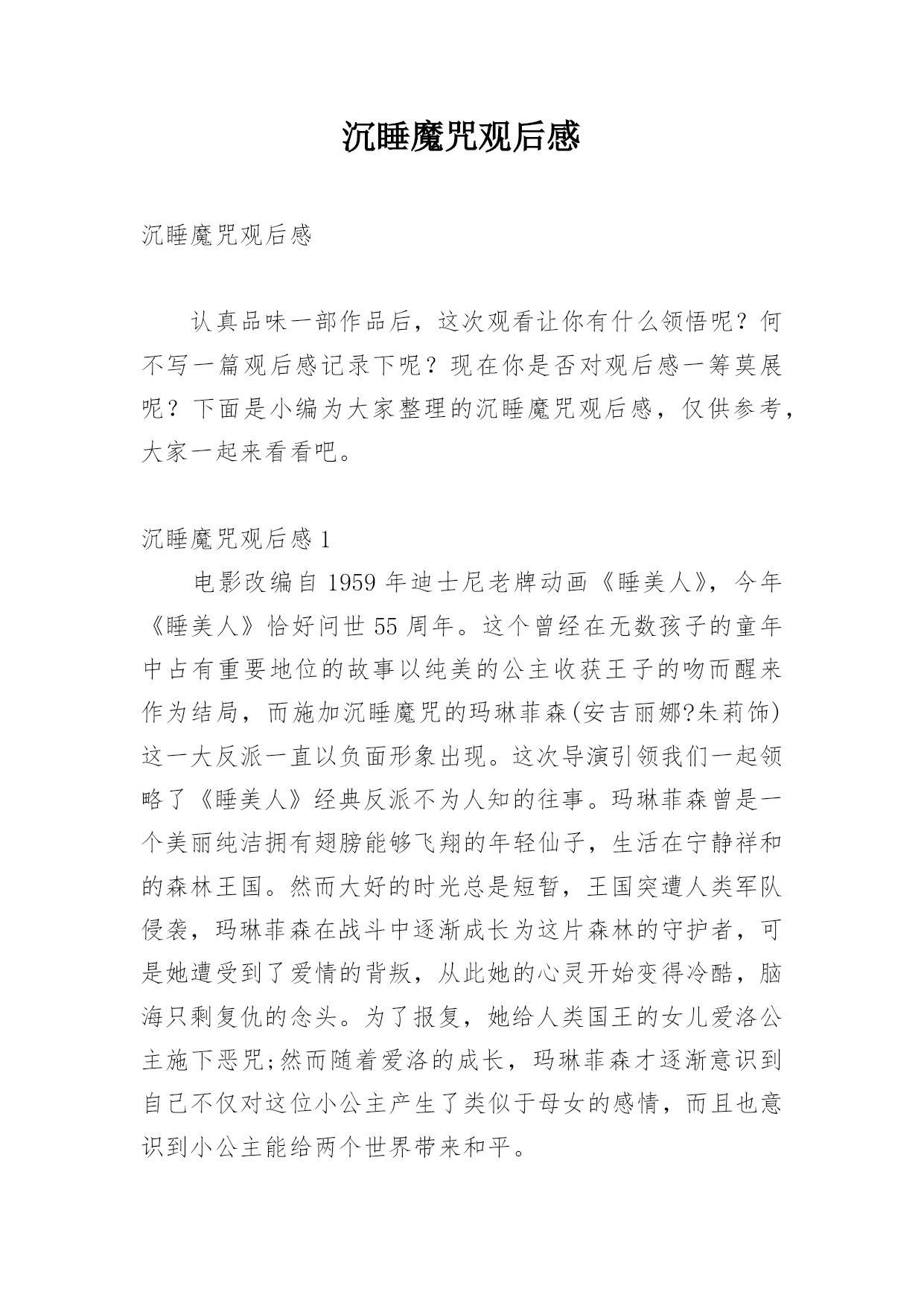 沉睡魔咒观后感沉睡魔咒观后感认真品味一部作品后,这次观看让你有什么领悟呢?何不写一篇观后感记录下呢?现在你是否对观后感一筹莫展呢?下面是小编为大家整理的沉睡魔咒观后感,仅供参考,大家一起来看看吧。沉睡魔咒观后感1电影改编自1959年迪士尼老牌动画《睡美人》,今年《睡美人》恰好问世55周年。这个曾经在无数孩子的童年中占有重要地位的故事以纯美的公主收获王子的吻而醒来作为结局,而施加沉睡魔咒的玛琳菲森(安吉丽娜?朱莉饰)这一大反派一直以负面形象出现。这次导演引领我们一起领略了《睡美人》经典反派不为人知的往事。玛