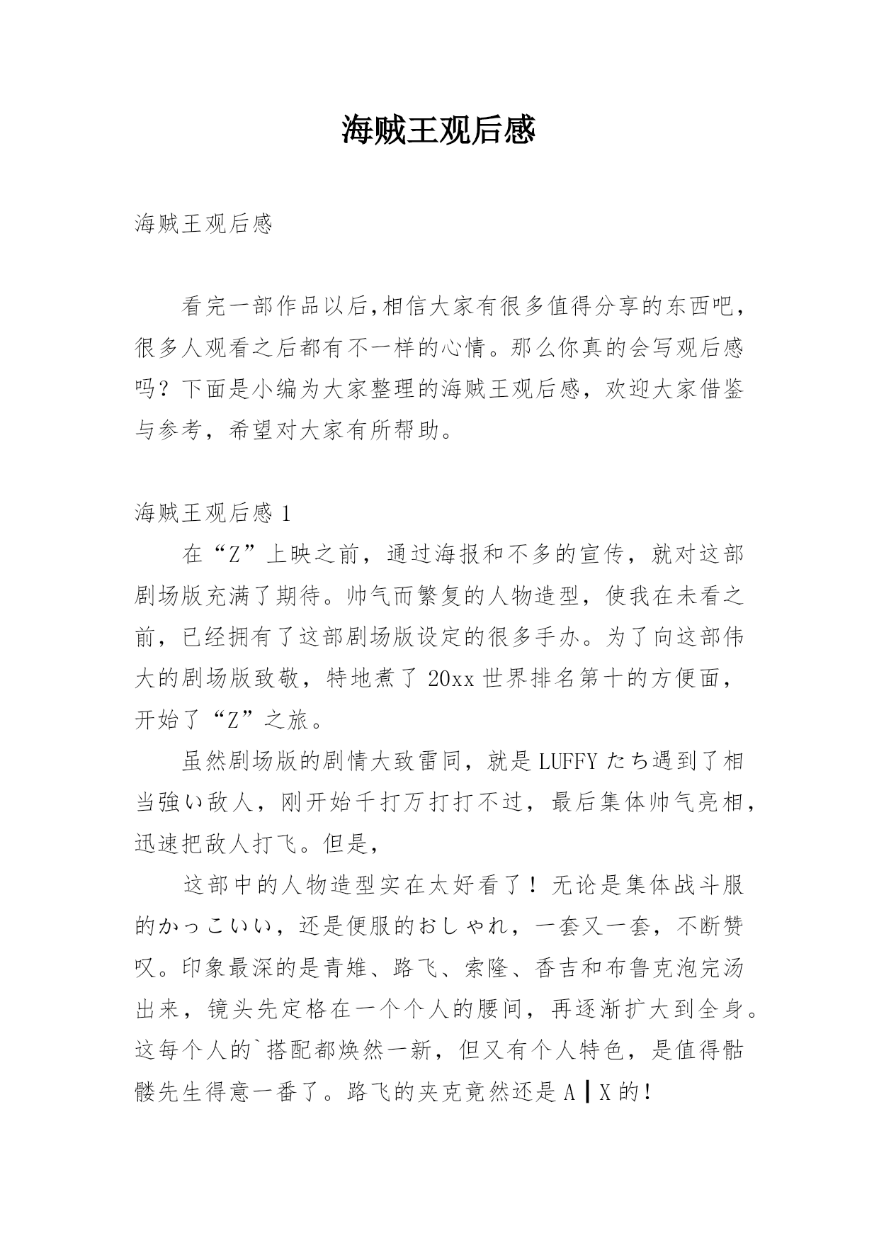 海贼王观后感海贼王观后感看完一部作品以后,相信大家有很多值得分享的东西吧,很多人观看之后都有不一样的心情。那么你真的会写观后感吗?下面是小编为大家整理的海贼王观后感,欢迎大家借鉴与参考,希望对大家有所帮助。海贼王观后感1在“Z”上映之前,通过海报和不多的宣传,就对这部剧场版充满了期待。帅气而繁复的人物造型,使我在未看之前,已经拥有了这部剧场版设定的很多手办。为了向这部伟大的剧场版致敬,特地煮了20xx世界排名第十的方便面,开始了“Z”之旅。虽然剧场版的剧情大致雷同,就是LUFFYたち遇到了相当強い敌人,刚