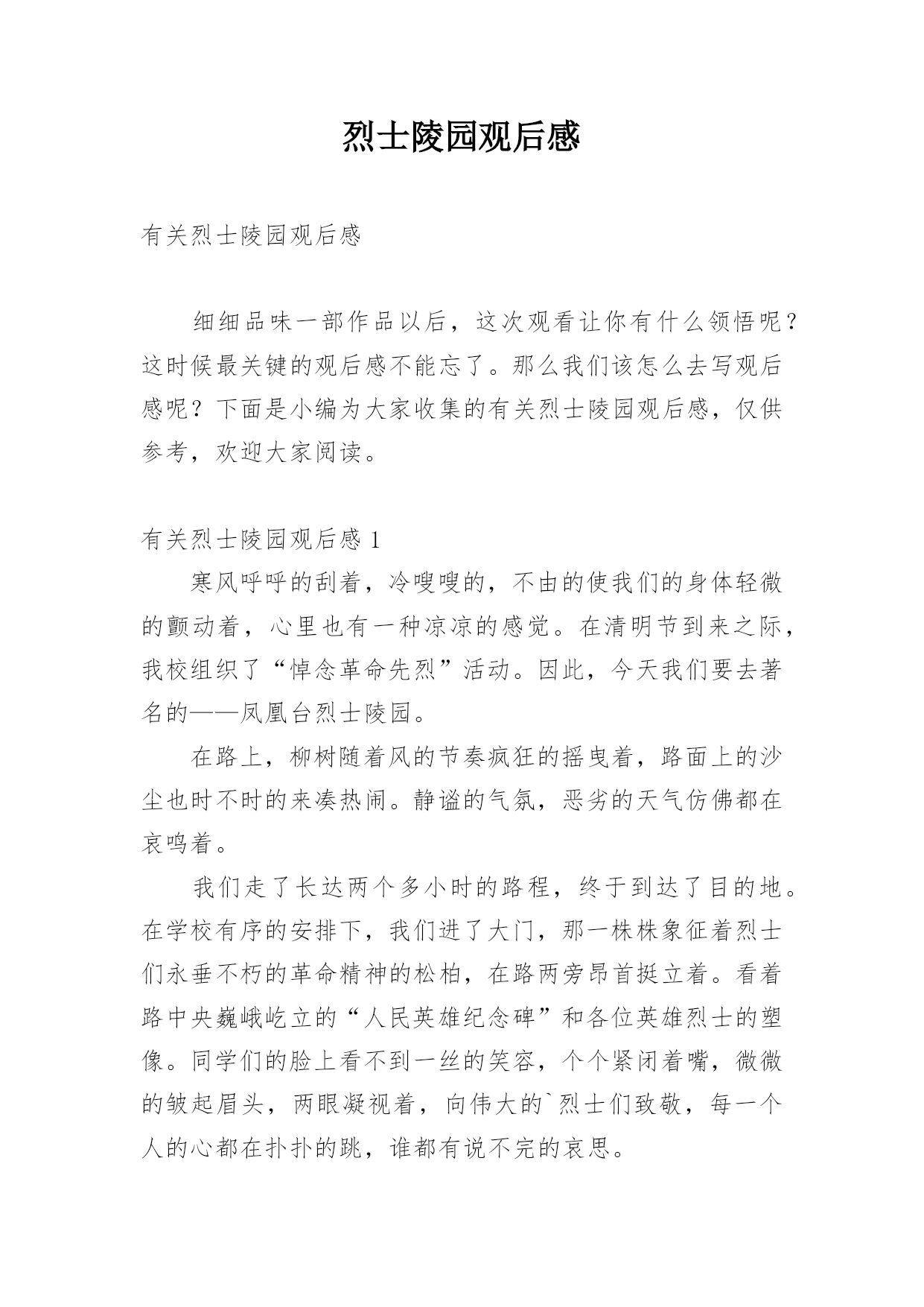 烈士陵园观后感有关烈士陵园观后感细细品味一部作品以后,这次观看让你有什么领悟呢?这时候最关键的观后感不能忘了。那么我们该怎么去写观后感呢?下面是小编为大家收集的有关烈士陵园观后感,仅供参考,欢迎大家阅读。有关烈士陵园观后感1寒风呼呼的刮着,冷嗖嗖的,不由的使我们的身体轻微的颤动着,心里也有一种凉凉的感觉。在清明节到来之际,我校组织了“悼念革命先烈”活动。因此,今天我们要去著名的——凤凰台烈士陵园。在路上,柳树随着风的节奏疯狂的摇曳着,路面上的沙尘也时不时的来凑热闹。静谧的气氛,恶劣的天气仿佛都在哀鸣着。我