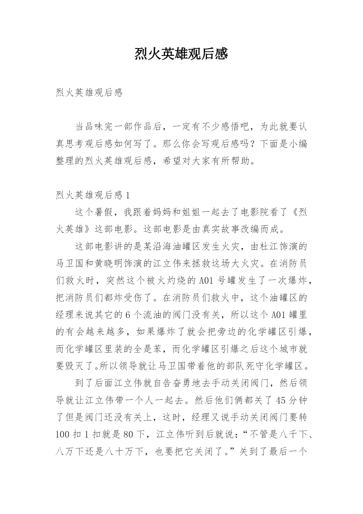 烈火英雄观后感烈火英雄观后感当品味完一部作品后,一定有不少感悟吧,为此就要认真思考观后感如何写了。那么你会写观后感吗?下面是小编整理的烈火英雄观后感,希望对大家有所帮助。烈火英雄观后感1这个暑假,我跟着妈妈和姐姐一起去了电影院看了《烈火英雄》这部电影。这部电影是由真实故事改编而成。这部电影讲的是某沿海油罐区发生火灾,由杜江饰演的马卫国和黄晓明饰演的江立伟来拯救这场大火灾。在消防员们救火时,突然这个被火灼烧的A01号罐发生了一次爆炸,把消防员们都炸受伤了。在消防员们救火中,这个油罐区的经理来说其它的6个流油