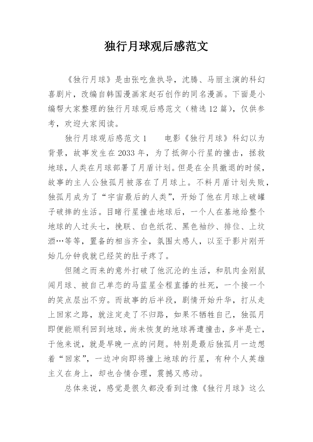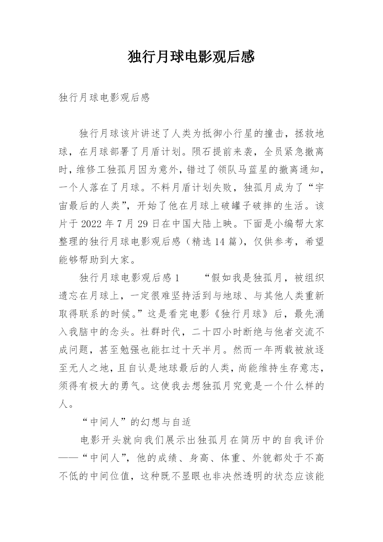 独行月球电影观后感独行月球电影观后感独行月球该片讲述了人类为抵御小行星的撞击,拯救地球,在月球部署了月盾计划。陨石提前来袭,全员紧急撤离时,维修工独孤月因为意外,错过了领队马蓝星的撤离通知,一个人落在了月球。不料月盾计划失败,独孤月成为了“宇宙最后的人类”,开始了他在月球上破罐子破摔的生活。该片于2022年7月29日在中国大陆上映。下面是小编帮大家整理的独行月球电影观后感(精选14篇),仅供参考,希望能够帮助到大家。独行月球电影观后感1“假如我是独孤月,被组织遗忘在月球上,一定很难坚持活到与地球、与其他人