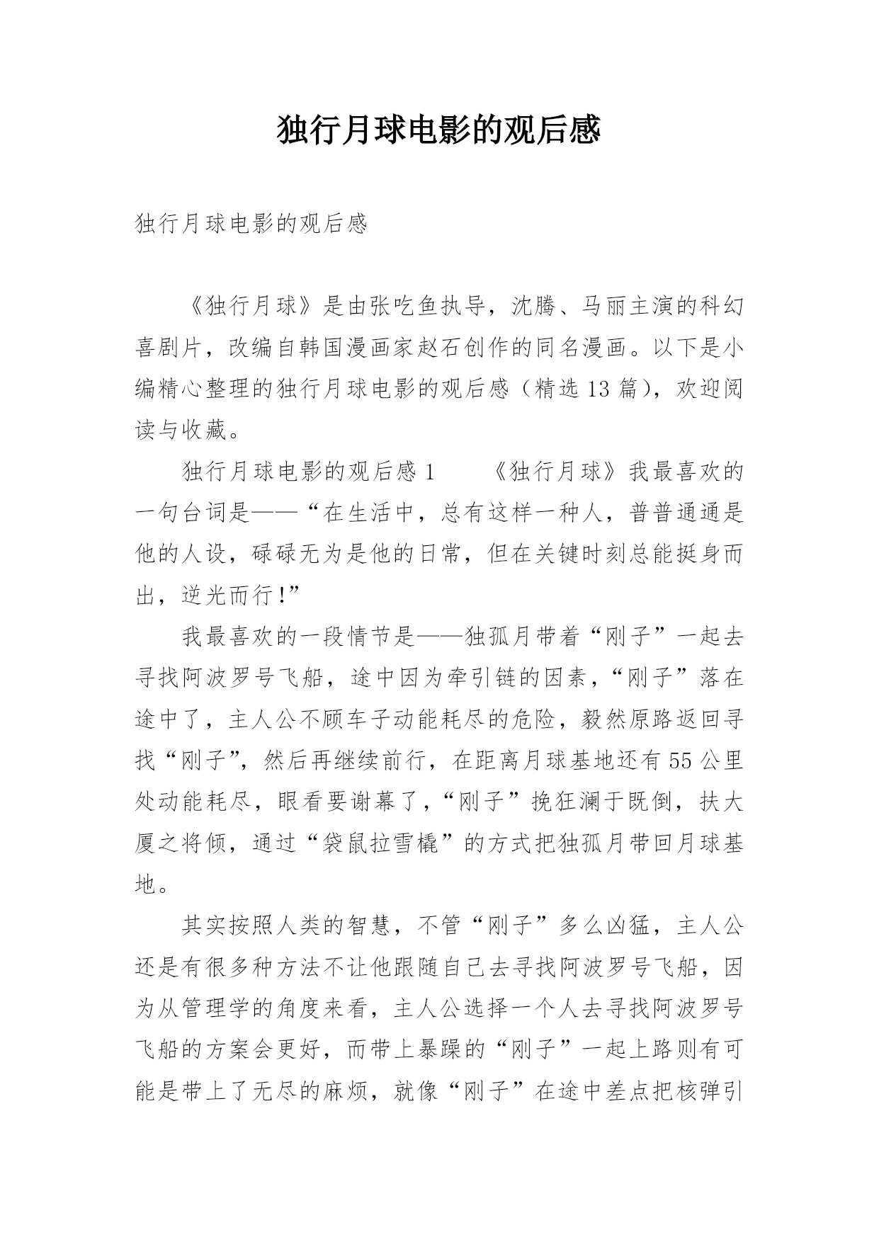 独行月球电影的观后感独行月球电影的观后感《独行月球》是由张吃鱼执导,沈腾、马丽主演的科幻喜剧片,改编自韩国漫画家赵石创作的同名漫画。以下是小编精心整理的独行月球电影的观后感(精选13篇),欢迎阅读与收藏。独行月球电影的观后感1《独行月球》我最喜欢的一句台词是——“在生活中,总有这样一种人,普普通通是他的人设,碌碌无为是他的日常,但在关键时刻总能挺身而出,逆光而行!”我最喜欢的一段情节是——独孤月带着“刚子”一起去寻找阿波罗号飞船,途中因为牵引链的因素,“刚子”落在途中了,主人公不顾车子动能耗尽的危险,毅然