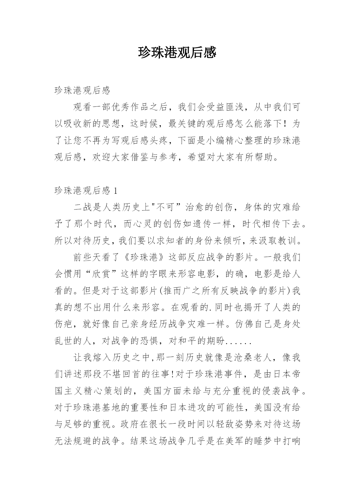 珍珠港观后感珍珠港观后感观看一部优秀作品之后,我们会受益匪浅,从中我们可以吸收新的思想,这时候,最关键的观后感怎么能落下!为了让您不再为写观后感头疼,下面是小编精心整理的珍珠港观后感,欢迎大家借鉴与参考,希望对大家有所帮助。珍珠港观后感1二战是人类历史上"不可”治愈的创伤,身体的灾难给予了那个时代,而心灵的创伤如遗传一样,时代相传下去。所以对待历史,我们要以求知者的身份来倾听,来汲取教训。前些天看了《珍珠港》这部反应战争的影片。一般我们会惯用“欣赏”这样的字眼来形容电影,的确,电影是给人看的。但是对于这部